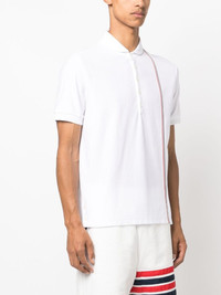 RWB stripe polo shirt A signature of the brand, the RWB stripes celebrate Thom Browne's American roots by mirroring the USA's national colours. Here, the trademark punctuates this white polo shirt, crossing the silhouette for an instantly recognisable look. Highlights - White/red/navy blue - Cotton - Jersey knit - Grosgrain ribbon trim - Rwb stripe - Signature grosgrain side tabs - Club collar - Short front button fastening - Short sleeves - Straight hem Made in Italy Composition Cotton 100% SIZE & FIT Model measurements Height 6 ft 2 in(1.87 m) Bust/Chest 38.18 in(97 cm) Hips 36.61 in(93 cm) Waist 29.13 in(74 cm) FittingInformation Designed for a regular fit, this polo shirt offers a comfortable loose fit throughout the body Made from a midweight non-stretch fabric, this piece offers minimal elasticity when worn This piece fits true to size – take your usual size Washing instructions Dry Clean Only