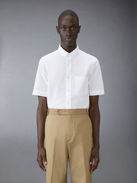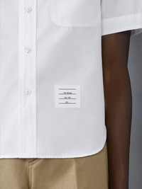 DETAILS & FIT A springtime essential, our Poplin Round Hem Shirt exhibits quality craftsmanship and meticulous tailoring. Front button closure Chest patch pocket Pleated back yoke with locker loop Nametag applique Signature striped grosgrain loop tab Model is 6'1" (185cm), wearing size 1 100% Cotton Made in Italy MWS322A-03113-100