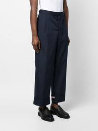RWB-stripe tailored trousers Thom Browne is renowned for redefining modern tailoring, as seen with these trousers. Adorned with RWB stripe detailing for a signature look, the cropped leg adds a modern touch to the pair. Highlights - Navy blue - Tailored cut - Rwb stripe - Mid-rise - Concealed front fastening - Straight leg - Slip pockets to the sides - Turn-up cuffs - Cropped leg Imported Composition Outer: Polyester 65%, Cotton 35% Lining: Cupro 100% SIZE & FIT Model measurements Height 6 ft 2 in(1.88 m) Bust/Chest 36.61 in(93 cm) Hips 35.82 in(91 cm) Waist 27.95 in(71 cm) FittingInformation Designed with a wide leg, offering a loose and roomy fit The adjustable tabs allow for fitted preferences Made from a midweight non-stretch fabric This piece fits true to size – take your usual size
