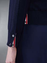 DETAILS & FIT A signature Thom Browne emblem defines this luxe cardigan— red and white grosgrain trim. Presented in 100% fine virgin wool, this cardigan is a classic that stands the test of time. V-neckline Front button closure Grosgrain placket Front patch pockets Buttoned cuffs Striped grosgrain armbands Button side vents Signature striped grosgrain loop tab Model is 6' 1" (185cm), wearing size 1 100% Virgin Wool MKC519A-Y1002-415