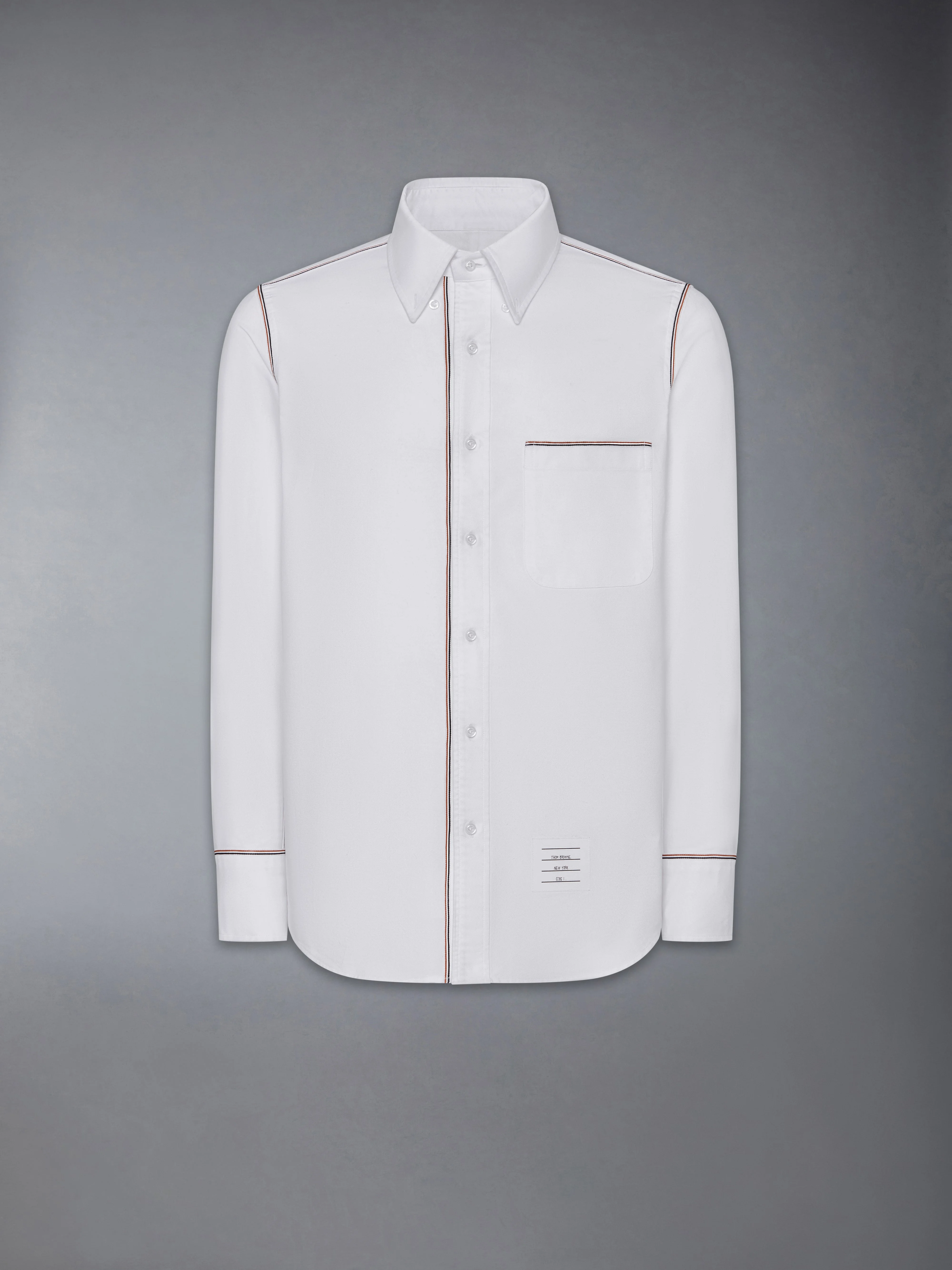 DETAILS & FIT A Thom Browne essential, our Oxford Grosgrain Framing Shirt exhibits quality craftsmanship and meticulous tailoring. Pair it with one of our signature trousers. Front button closure Patch chest pocket Name tag applique above hem Pleated back yoke with locker loop Signature striped grosgrain loop tab Model is 6' 1" (185cm), wearing size 1 100% Cotton Made in ITALY MWL406A-F0313-100