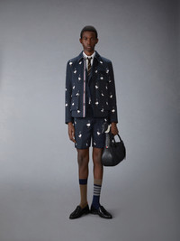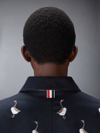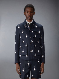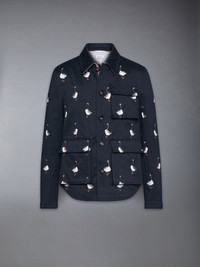 As geese prepare to take flight for their annual journey, gathering in graceful formations, they set their sights on new beginnings and the promise of something greater. Their transition marks the passage of time—a constant reminder that every fresh start is a journey toward growth. This piece is adorned with satin-stitch embroidered geese, symbolizing change, unity, and the courage to embrace what's next. Step into the season with renewal, purpose, and exceptional style. Complete the look with our Satin Stitch Goose Utility Shorts. Front button closure with striped grosgrain placket 3 Front flap pockets Interior pocket with name tag Signature striped grosgrain loop tab Model is 6'1" (185cm), wearing size 1 100% Cotton Made in Italy MJO248E-E1361-415