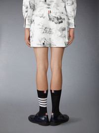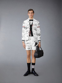 Can you spot Hector? These shorts capture a serene moment in nature—geese meandering across the fabric, pausing mid-migration. The intricate print is meticulously placed onto the fabric, ensuring uninterrupted alignment across the pockets and seams. This technique speaks to the precision and craftsmanship at the heart of Thom Browne. Complete the suit with our Scenic Toile Cotton Canvas Unconstructed Sport Coat. Pull-on Drawstring waistband with silver tone aglets 2 Flap pockets Signature striped grosgrain loop tab Model is 6'1" (185cm), wearing size 0 100% Cotton Lining: 100% Cotton Made in Italy MTU342A-F0977-980