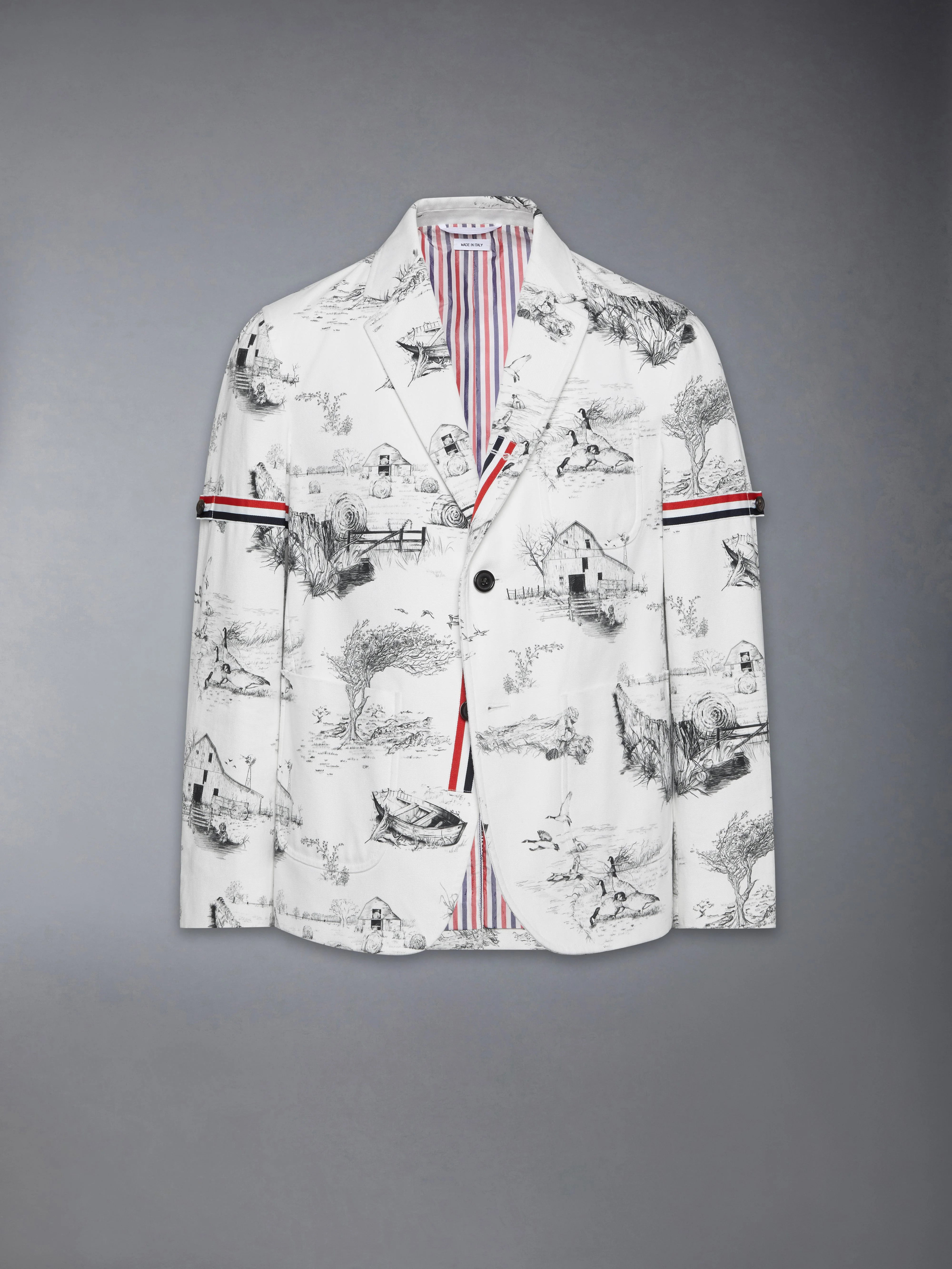 A true work of art, this sport coat captures a serene moment in nature—geese meander across the fabric, pausing mid-migration, while Hector quietly moseys through the scene. The print is meticulously placed onto the fabric, ensuring uninterrupted alignment across the collar, pockets, and seams—an intricate technique that speaks to the precision and craftsmanship at the heart of Thom Browne. Signature details, including striped grosgrain armbands, add a twist. Complete the suit with our Scenic Toile Cotton Canvas Cargo Rugby Shorts. Front button closure with striped grosgrain placket 3 Front patch pockets Buttoned armbands with signature striped grosgrain trim Interior pockets with name tag Signature striped grosgrain loop tab Fit 2 Model is 6'1" (185cm), wearing size 1 100% Cotton Lining: 100% Cupro Lining 2: 100% Cupro Made in Italy MJU505O-F0977-980
