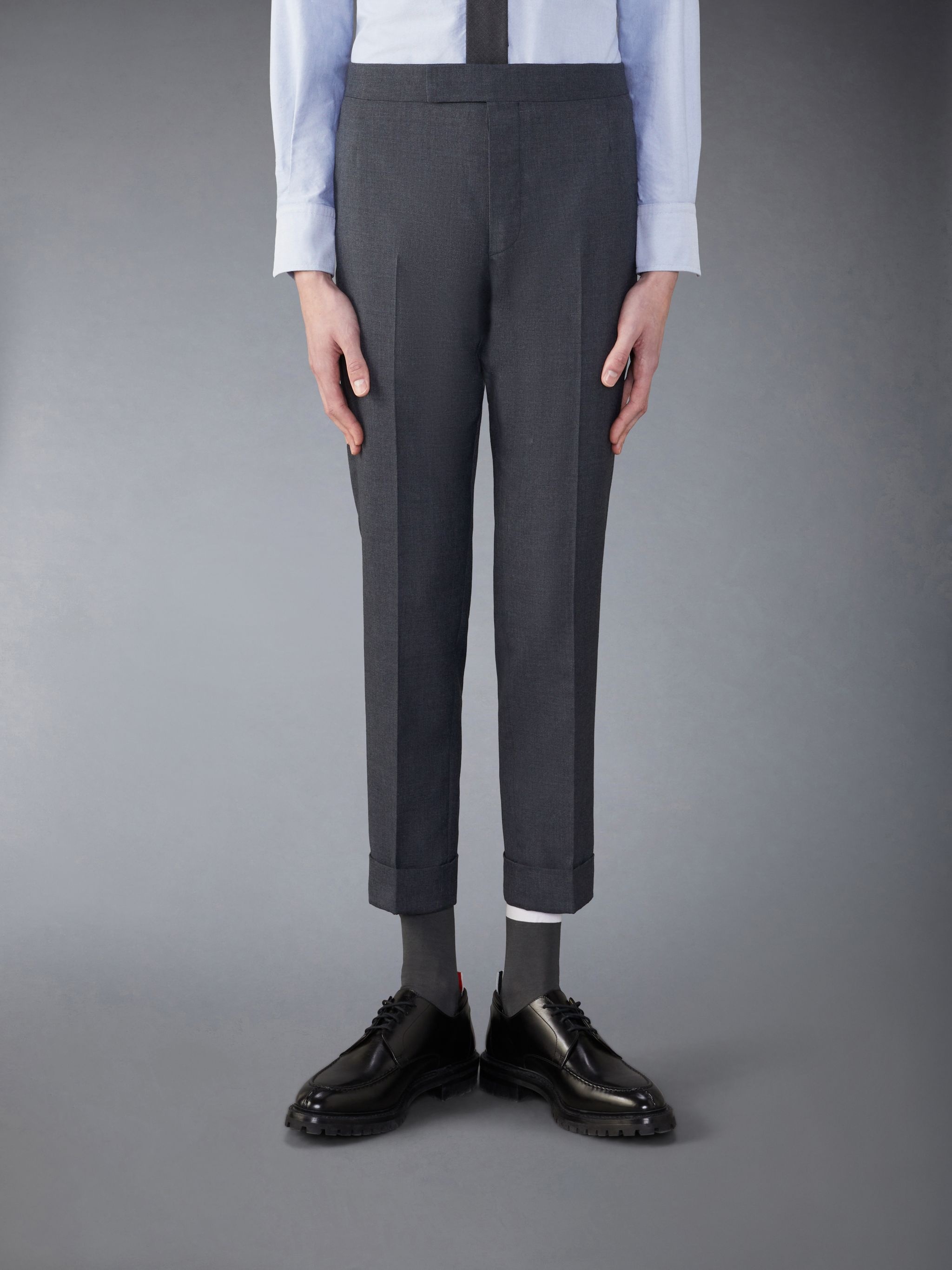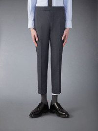 DETAILS & FIT At Thom Browne, uniformity is novel. Our School Uniform Mid Rise Skinny Trouser reinvents a classic silhouette with inventive hemlines and signature brand emblems. Complete the look with our School Uniform Sport Coat. Tab front closure Slip side pockets Button-fastening back welt pockets Button backstrap Signature striped grosgrain loop tab Model is 6' 1" (185cm), wearing size 0 50% Wool, 50% Polyester Lining: 100% Cupro Made in Italy MTC224A-02872-025