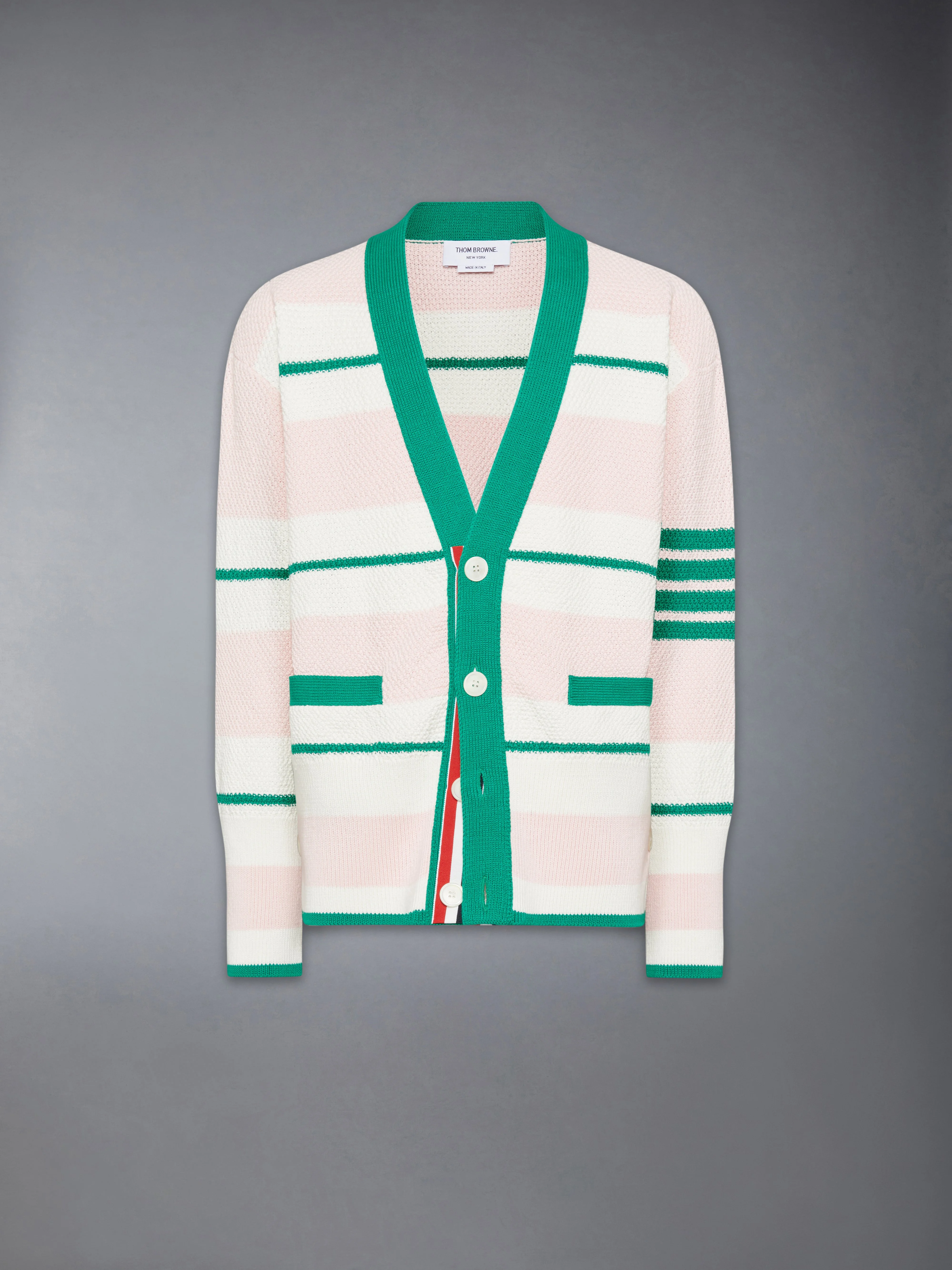 Knitted in compact cotton seed stitch, this V-neck cardigan channels the brand’s interplay between uniform rigor and craft. The heavy-gauge texture adds structure and depth, offset by engineered 4-Bar stripes and RWB grosgrain trims—an emblem of classic codes elevated through precision. V-neckline. Ribbed trim along neckline and placket. Front button closure with RWB grosgrain placket. Welt hand pockets with ribbed trim. Buttoned cuffs and side vents with RWB grosgrain trim. High ribbed cuffs and hem. Engineered 4-bar detailing. Name tag applique. Signature striped grosgrain loop tab. 100% Cotton MKC641A-Y3016-642