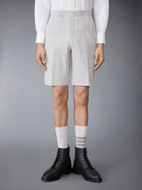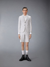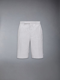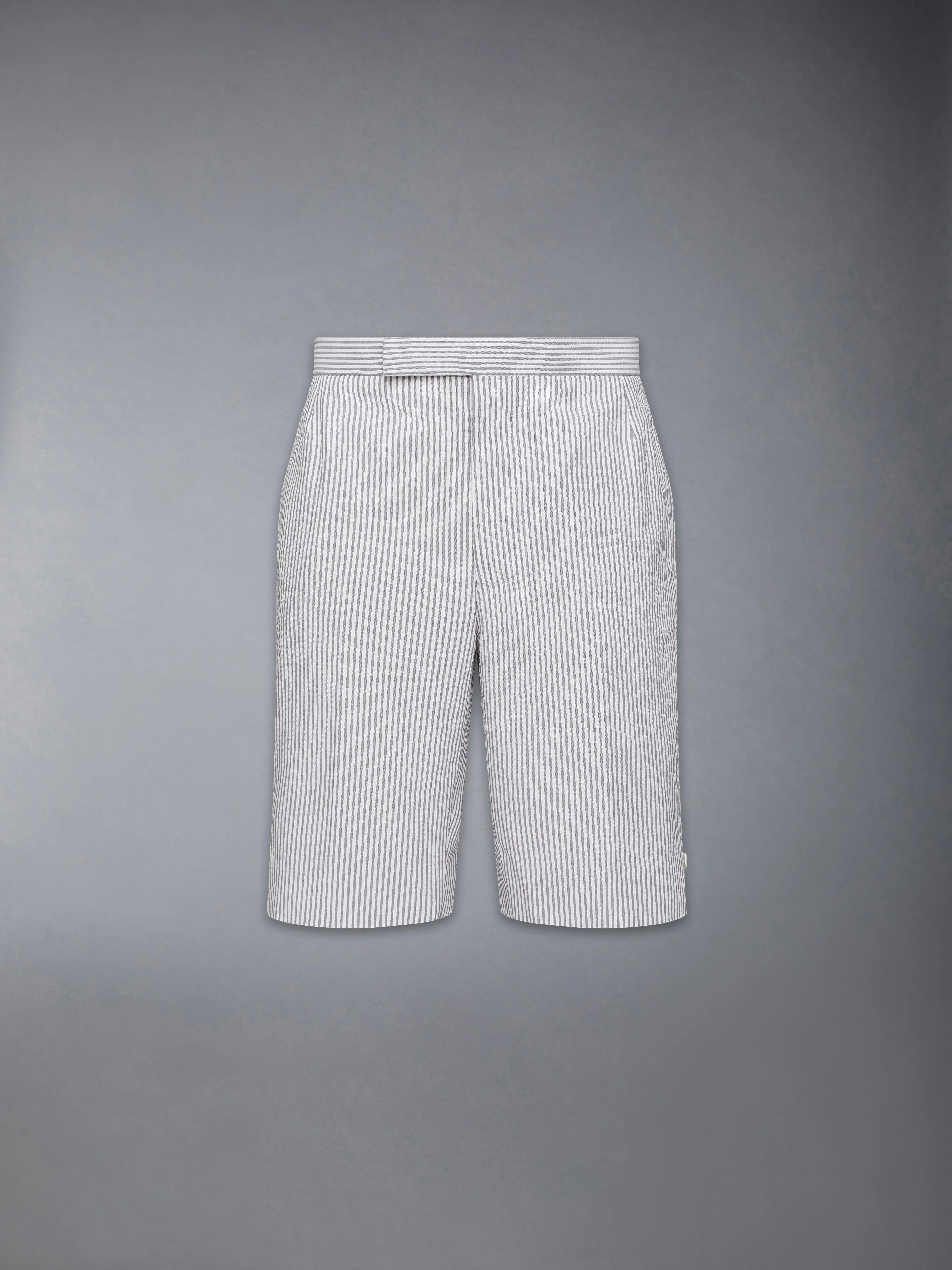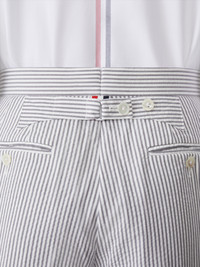 Our Classic Seersucker Backstrap Shorts. Wide cuffs pay homage to Thom Browne distinguished tailoring. Enjoy our airy seersucker fabric during warmer months. Tab closure Creased legs Notched cuffs Slip side pockets Button-fastening jetted hip pockets Adjustable buttoned backstrap Signature striped grosgrain loop tab at back waist Classic Fit 1 Model is 6' 1" (185cm), wearing size 0 100% Cotton Lining: 100% Cupro Made in Italy MTC002A-00572-035