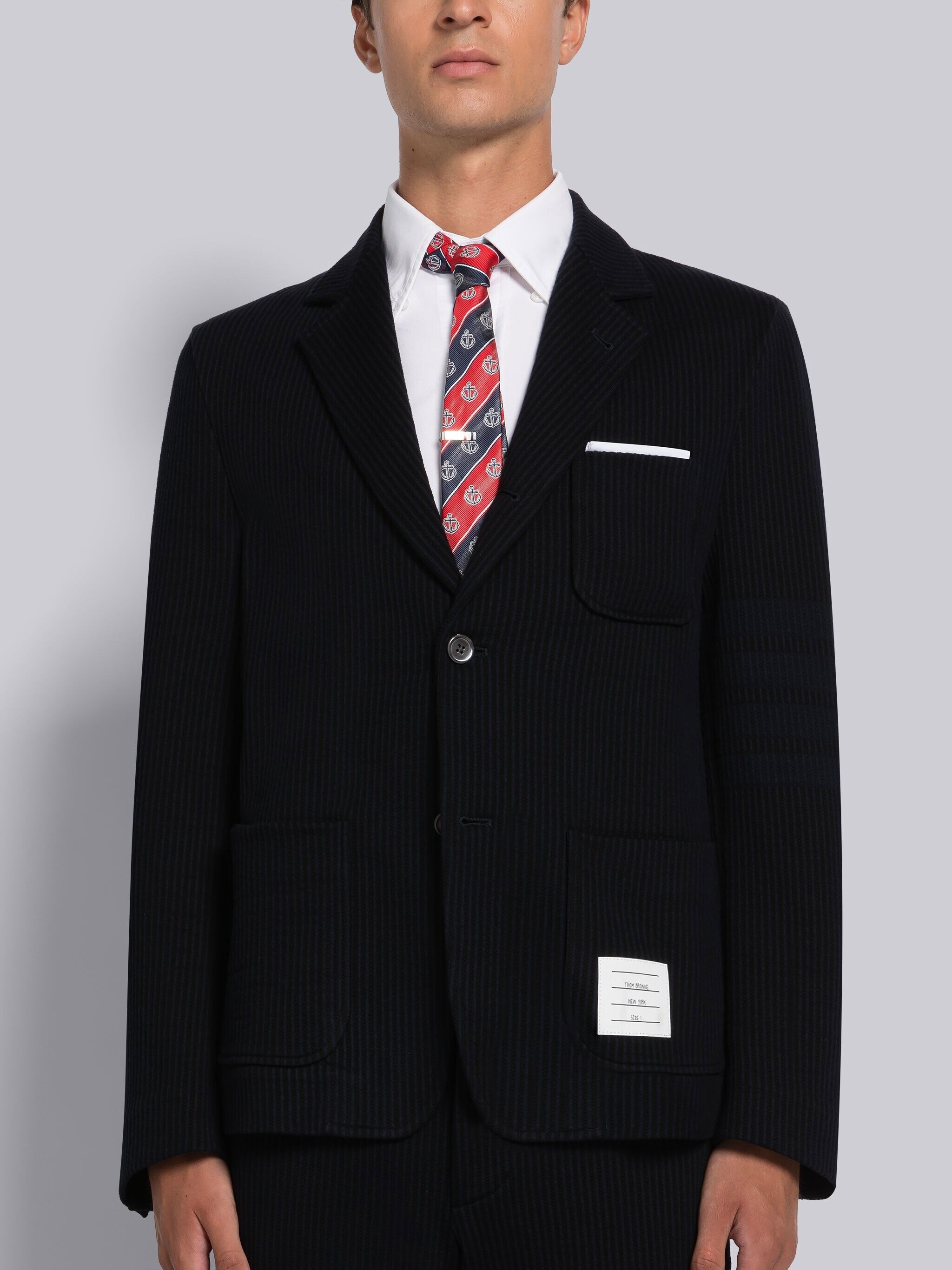 DETAILS & FIT Sack jacket in seersucker loopback. 3-button front closure, notched lapels, 3 patch front pockets. Buttoned cuffs with signature striped grosgrain trim. Single back vent. Signature striped grosgrain loop tab at back of neck. Sack - Fit 2. Model is 6' 1" (185cm), wearing size 0. 100% Cotton Made in Italy MJT369AJ0063415
