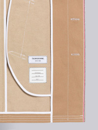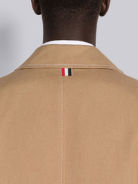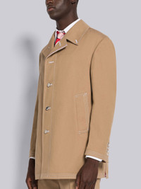 DETAILS & FIT Bal collar overcoat in camel selvedge denim with white track stitching. Front button closure, slant welt side pockets, buttoned cuffs, buttoned double back vent. Unlined. Signature striped grosgrain loop tab at back of neck. Model is 6' 1" (185cm), wearing size 0. 100% Cotton Made in Italy MOU610AF0164250
