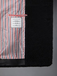 DETAILS & FIT The pinnacle of cold-weather sophistication — our Shearling 4-Bar Peacoat. Signature Thom Browne emblems put a twist on fine winter wear. Front button closure 4-bar stripe detail at left sleeve Single back vent Signature striped grosgrain loop tab at back of neck. Model is 6' 1" (185cm), wearing size 0 100% Shearling Leather Made in Italy MOU544X-02821-001