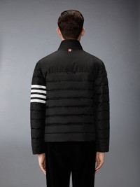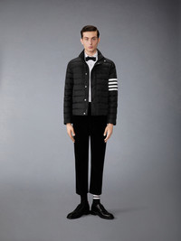 Shiny ripstop enters the collection as a lightweight, weather-resistant fabric, crafted into a down jacket that balances warmth with tailored form. A subtle sheen and durable grid texture bring depth to the material, while 4-bar detailing grounds the piece in Thom Browne’s signature language. Complete the look with the season’s All-Terrain Boot—blending rugged functionality with elevated design. Front snap closure with hidden zip Stand collar Hand pockets with hidden zips Interior zip pockets Plain back yoke with locker loop Tricolor lining 4-bar detailing Signature striped grosgrain loop tab Model is 6'1" (185cm), wearing size 1 81% Polyamide, 19% Polyester Combo 1: 100% Polyester Padding: 80% White Goose Down, 20% White Goose Feathers Made in Italy MJD136X-F1095-001