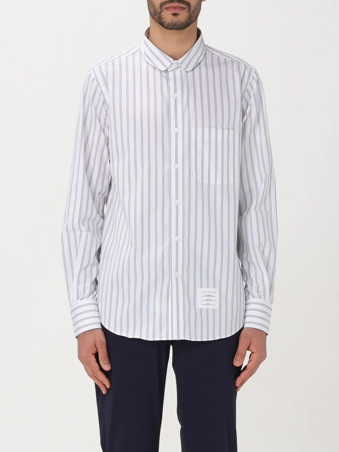 DESCRIPTION - Style: Classic - Logo: Back, Flag, With logo - Neck: Classic - Shoulders: Regular - Sleeves: Long - Cuffs: 2-button - Closure: With buttons - Pockets: Patch pocket - Bottom: With curved hemline - Occasion: Morning - Materials: Cotton poplin - Pattern: Stripes DETAILS AND CARE Composition 100% COTTON SIZE AND FIT Sizes not available Size and fit Regular fit Designer code: MWL392AF0521 035 Giglio Code: F28607 Designer: Thom Browne Collection: Thom Browne Men Category: Clothing Thom Browne