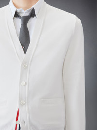 DETAILS & FIT A signature Thom Browne emblem defines this classic cardigan — iconic 4-Bar stripes synonymous with the brand. Presented in lightweight silk pique fabric, this cardigan is a longstanding staple. V neckline Front button closure 4-bar detailing Front slip pockets Signature striped grosgrain loop tab Model is 6'1" (185cm), wearing size 1 100% Silk Made in Italy MJT516A-J0192-100