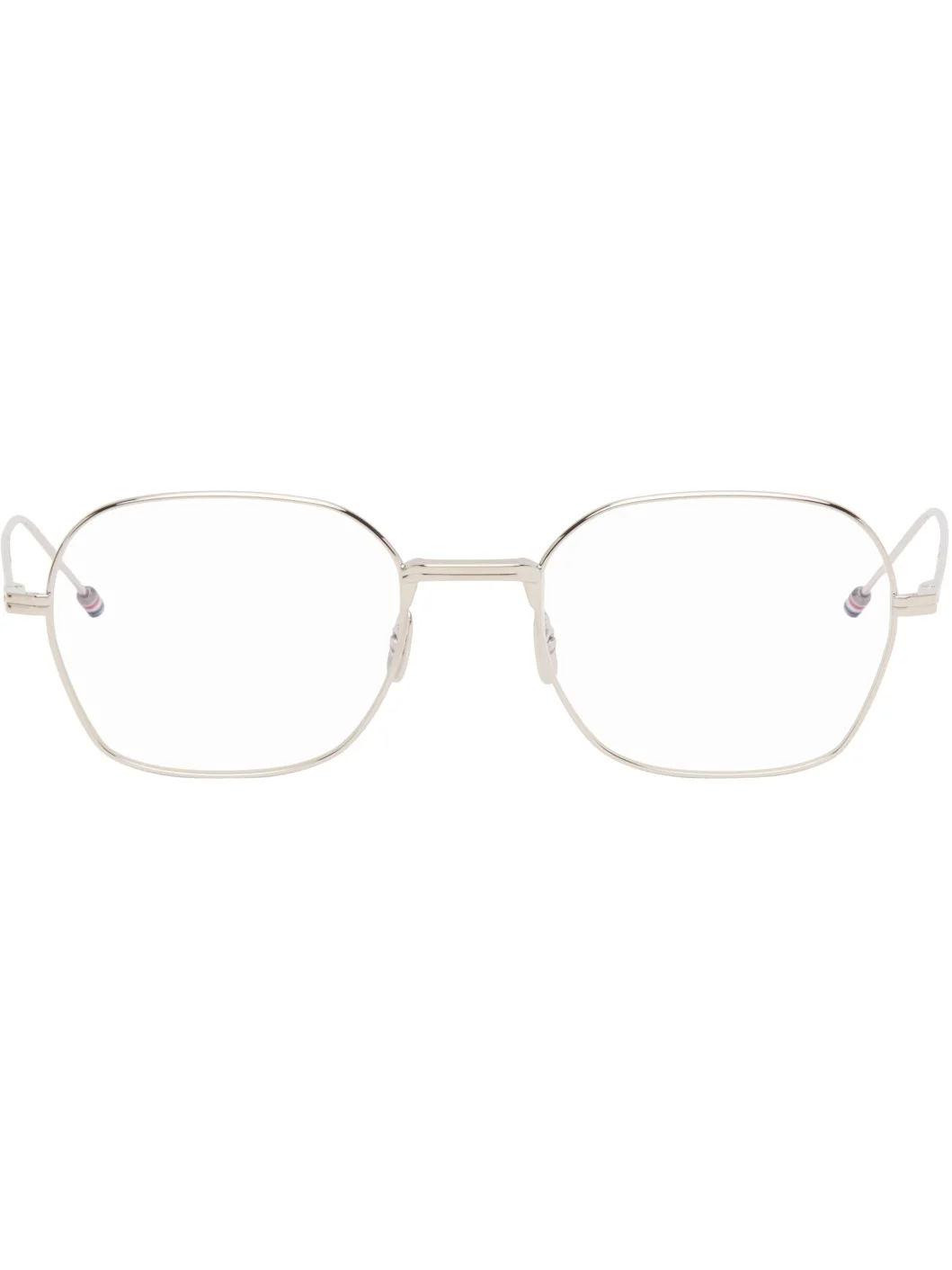 Square titanium-frame optical glasses. · Adjustable nose pads · Enameled tricolor stripes at temple tips · Includes case · Size: 54.20 144 Supplier color: Silver Titanium. Made in Japan 252381M133027