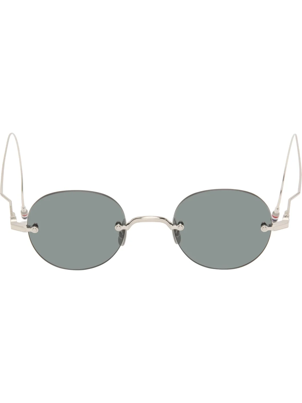 Round rimless titanium-frame sunglasses. · Anti-reflective gray lenses · Adjustable nose pads · Enameled tricolor stripes at temple tips · Includes case · Size: 52.20 120 Supplier color: Silver Titanium. Made in Japan 252381M134004