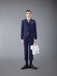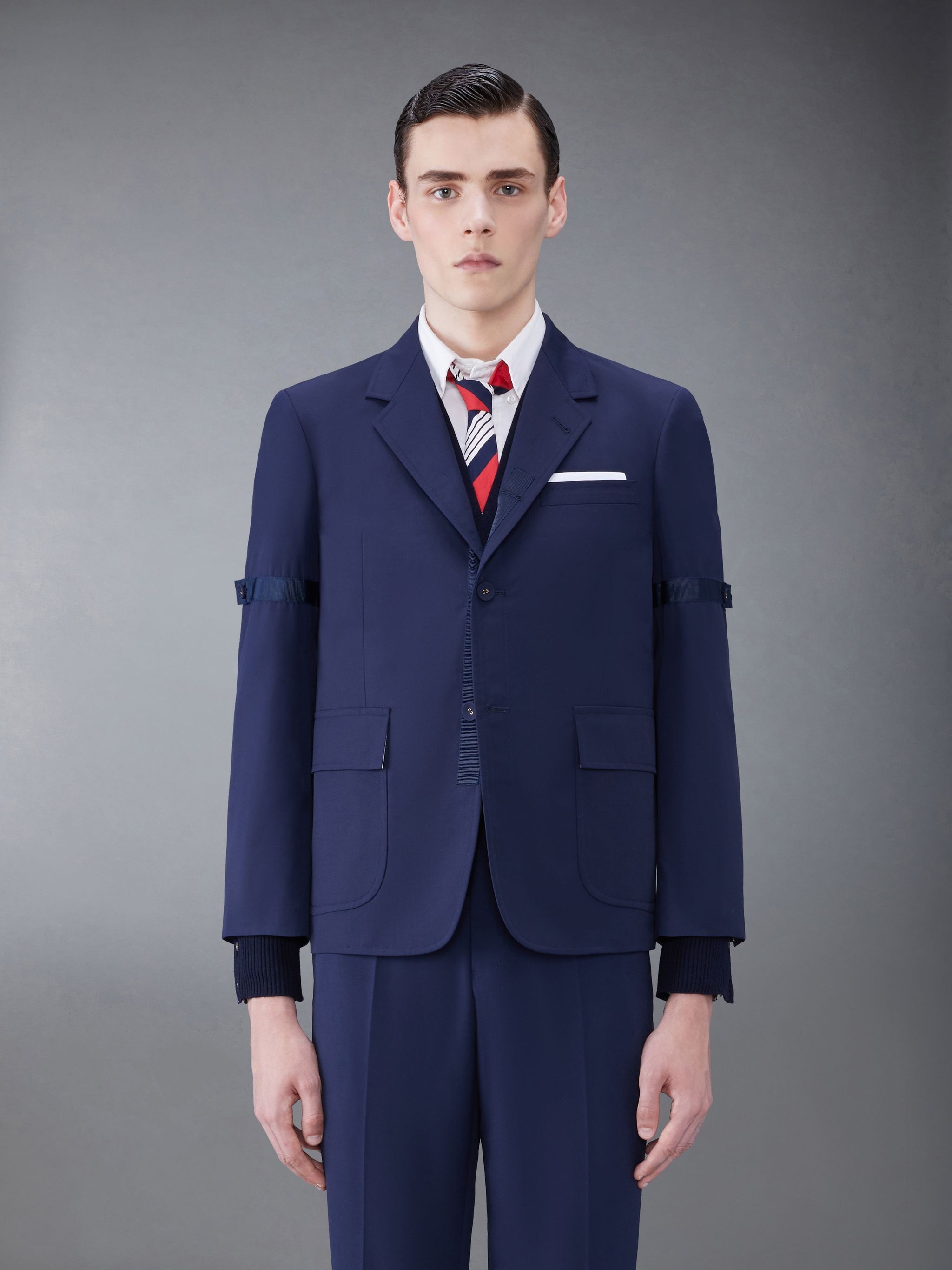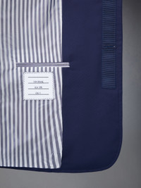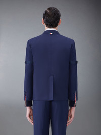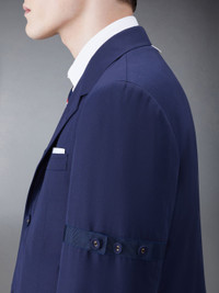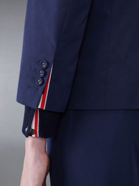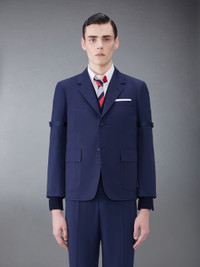 DETAILS & FIT This dapper sport coat exudes Thom Browne's mastery of innovative design and tailored excellence. Our iconic grosgrain trim lines the front placket and buttoned armbands. Front button closure Armbands Unstructured straight fit Buttoned cuffs with signature striped grosgrain trim 2 flap pockets Single chest pocket Single back vent Model is 6' 1" (185cm), wearing size 0 65% Polyester, 35% Cotton Lining: 100% Cupro MJU558O-04502-415