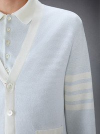 A signature Thom Browne emblem defines this luxe cardigan — 4-bar detailing, inspired by midcentury collegiate and sports uniforms. Presented in breathable linen cotton waffle fabric, this is a classic piece that will stand the test of time. Front button closure with striped grosgrain placket 2 Front slip pockets 4-bar detailing Signature striped grosgrain loop tab Model is 6'1" (185cm), wearing size 1 68% Linen, 32% Cotton Made in Italy MKC595A-Y6011-480 MKC595A-Y6011-480