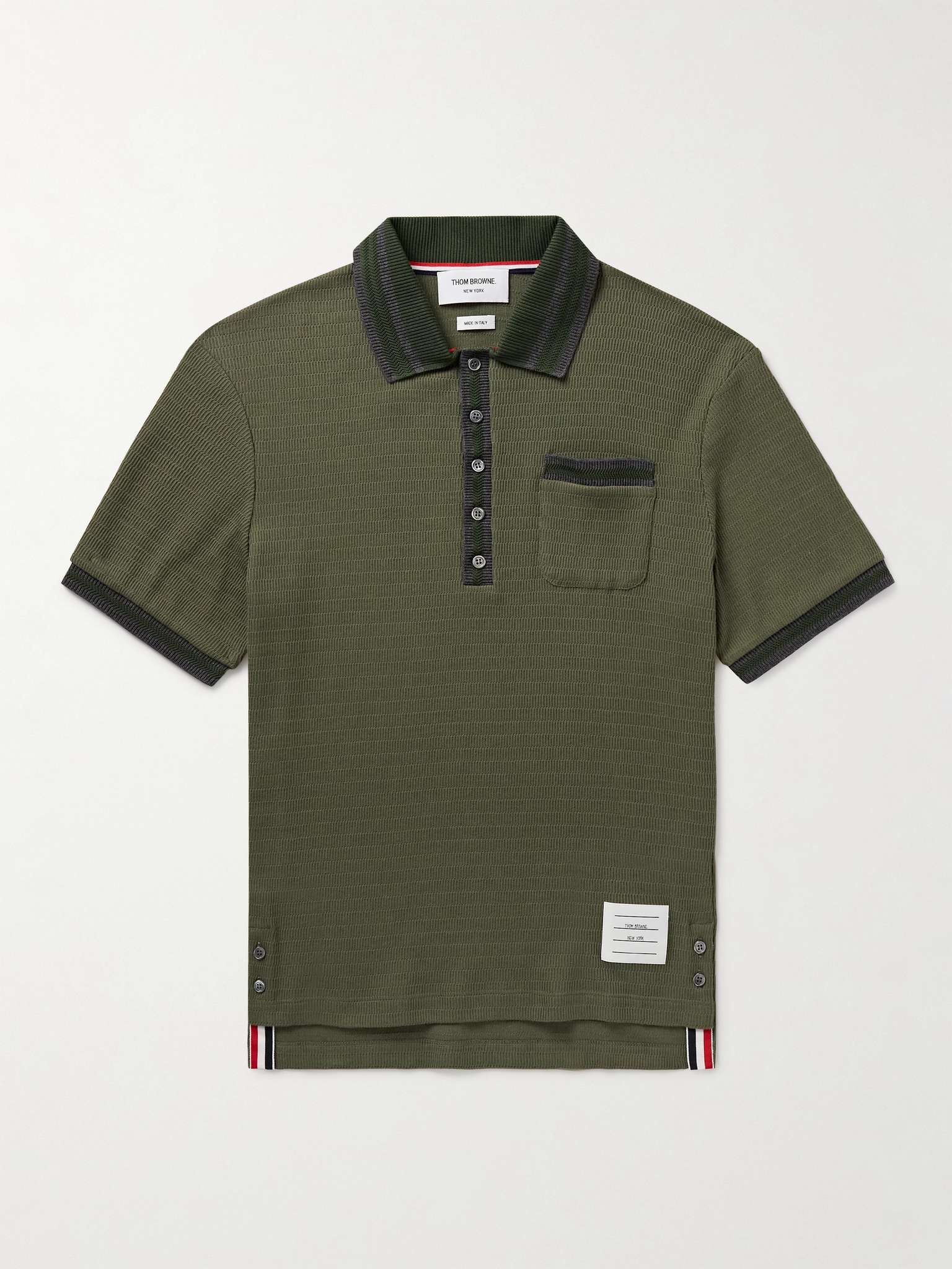 Thom Browne's polo shirt is designed with plenty of signature details like a logo patch and button-fastening side slits trimmed with tricolour grosgrain. It's pointelle-knitted from cotton and finished with contrasting stripes. Size & Fit - Size 0 = XS, 1 = S, 2 = M, 3 = L, 4 = XL, 5 = XXL and 6 = XXXL - Fits true to size. Take your normal size - Designed for a slim fit - Lightweight knit - Model is shown wearing a 1 - Model measures: chest 36"/ 92cm, height 6'2"/ 188cm Details & Care - Army-green cotton, dark-green and dark-grey mélange cotton-blend - Button fastenings - 100% cotton - Hand wash or dry clean - Mother-of-pearl: China