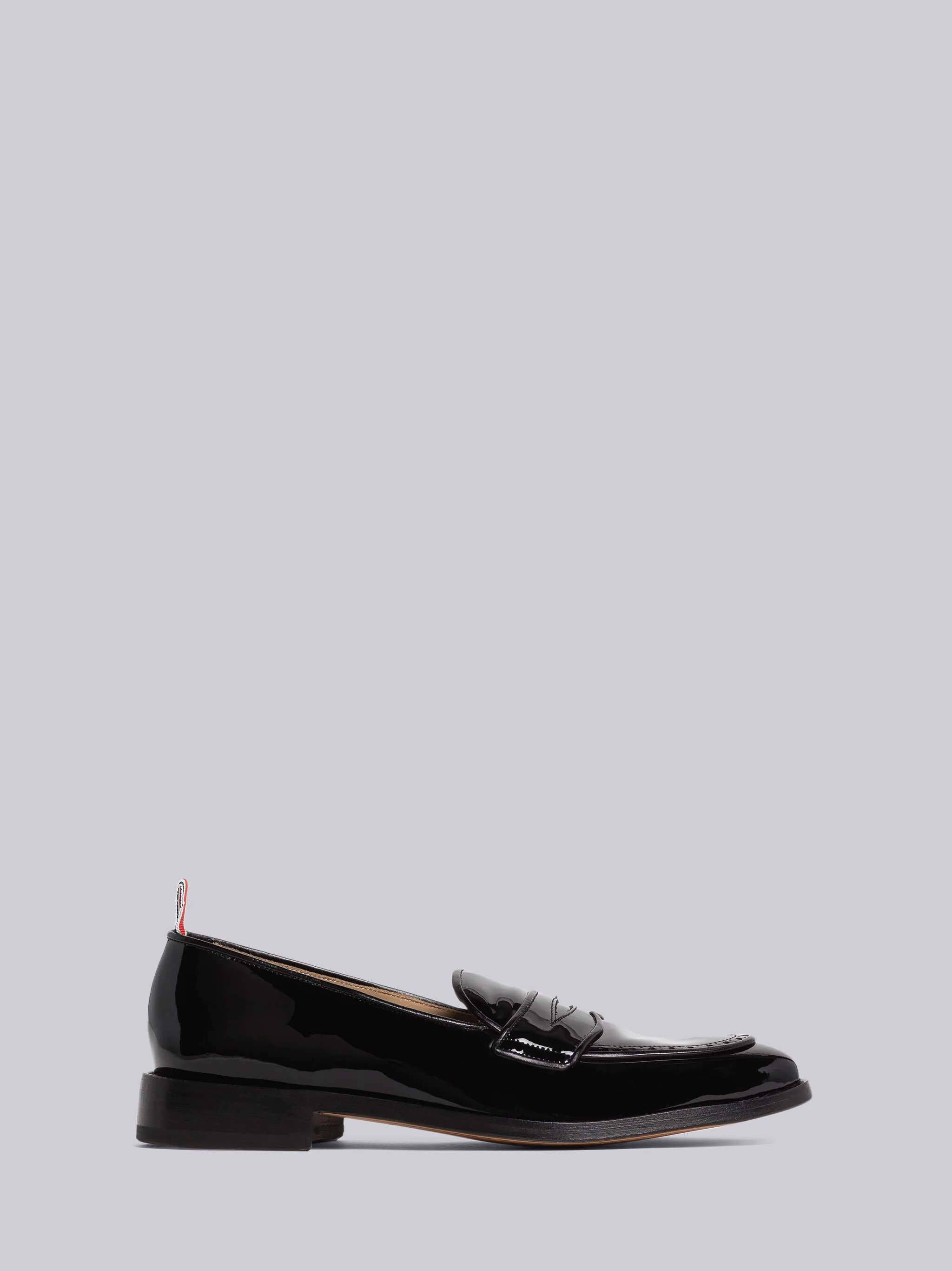 DETAILS & FIT Varsity penny loafer in soft black patent leather. Penny vamp strap. Flexible leather sole. Signature striped grosgrain loop tab at heel. Upper:100% Calf Patent Leather Sole:100% Calf Leather Lining:100% Calf Leather Made in Italy MFL087A00216001