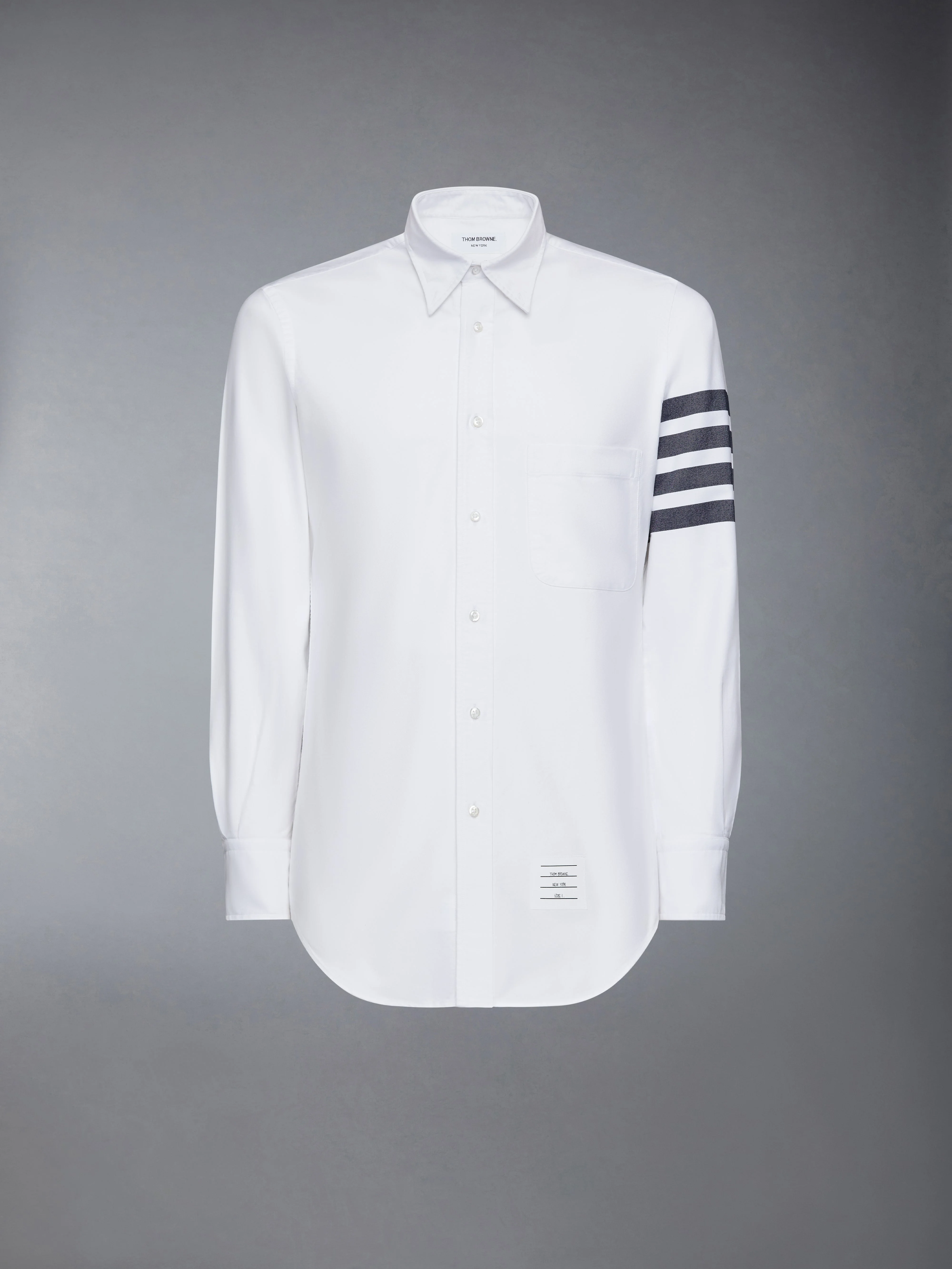 Classic point collar shirt in solid white Oxford with 4-bar stripe detail at left sleeve in dark grey. Front button closure, point collar, patch chest pocket, name tag applique above shirttail hem. Pleated buttoned cuffs, pleated back yoke with locker loop. Signature striped grosgrain loop tab at back of neck. Model is 6' 1" (185cm), wearing size 1. 100% Cotton Made in Italy MWL001A-00245-415