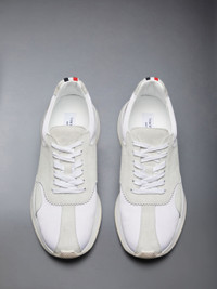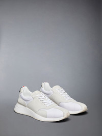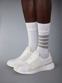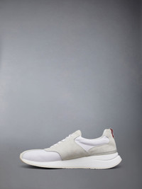 DETAILS & FIT Leisurewear made artful. These comfortable sneakers pair perfectly with any of our fine suits or casual wear. The limited-edition earthy white hue is a celebration of the season. Lace up closure Leather lining Rubber sole Signature striped grosgrain loop tabs Combo1: 100% Calf Suede Split Leather Upper: 73% Polyester, 27% Polyamide Lining: 100% Calf Leather Sole: 100% Rubber Made in Italy MFE002B-F0488-100