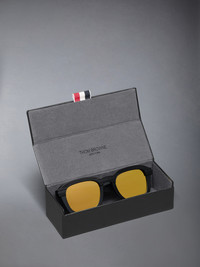 These frames explore volume and form through double-injection construction, fusing nylon and rubber in a unified silhouette that transforms material fusion into sculptural depth—bold in presence, refined in finish. Made in Japan, the piece is fitted with polarized lenses that reduce glare, enhance optical clarity, while 4-bar detailing and tricolor enamel temple tips complete the design. Rectangular shape Signature 4-bar Striped enamel temple tips Eco-leather case RWB lanyard Frame: tr90 matte black nylon / black rubber Hinges: silver Lenses: heavy gold mirror lens polarized Lens Width: 48.5mm Nose Bridge Length: 21.5mm Temple Length: 148mm 50% Thermoplastic Polyurethane, 50% Plastic Made in Japan UES940A-G0004-001