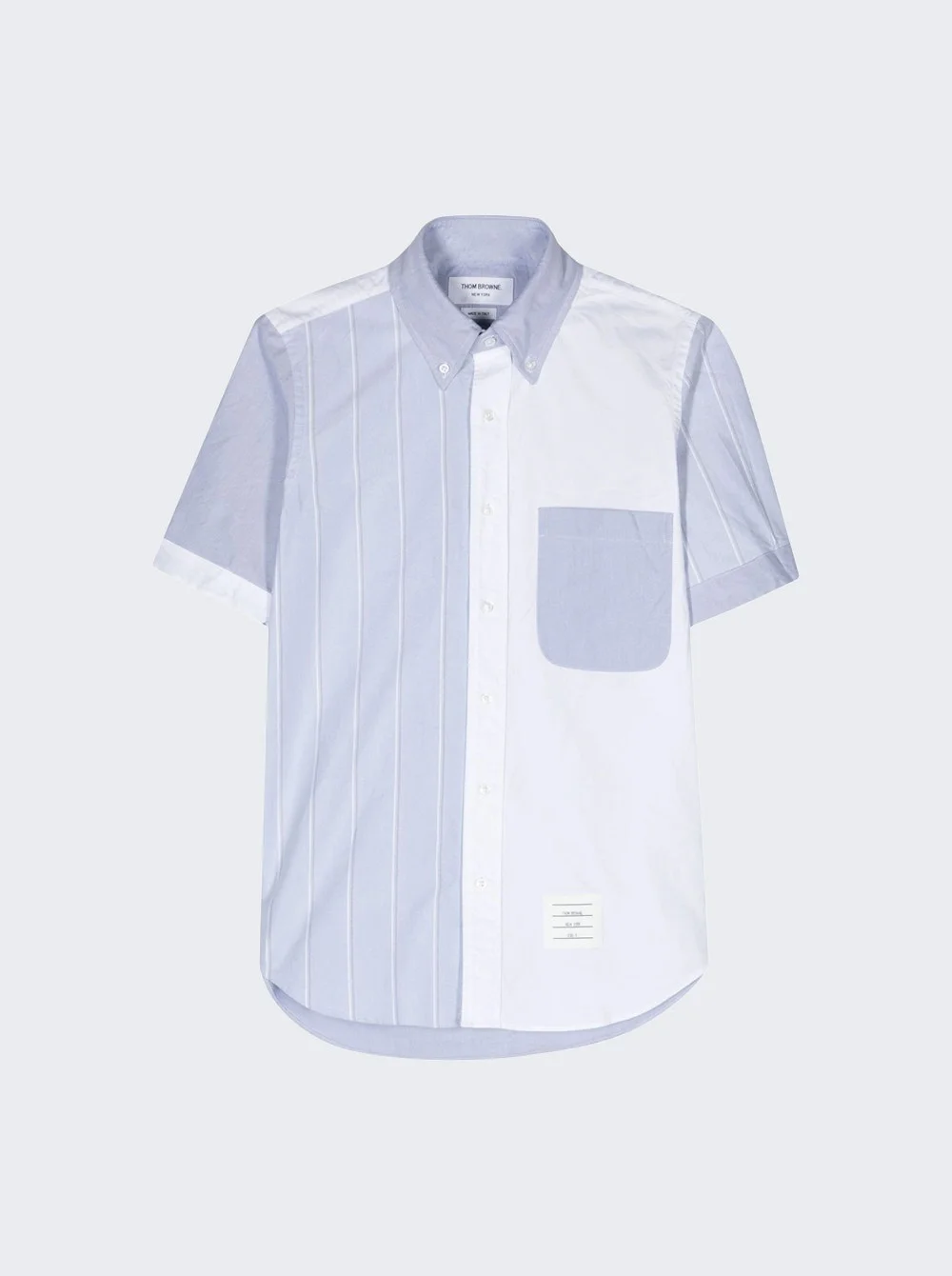 Details - Straight fit button-down shirt - Short sleeves - Color-block paneled design - Classic collar - Front button fastening - Chest patch pocket - Curved hem Dimensions: Model is 6'1"/185cm and is wearing a size 2 Composition: 100% Cotton Care: Care according to label Brand Style: MWS239F-F0660 Designer/Brand: THOM BROWNE