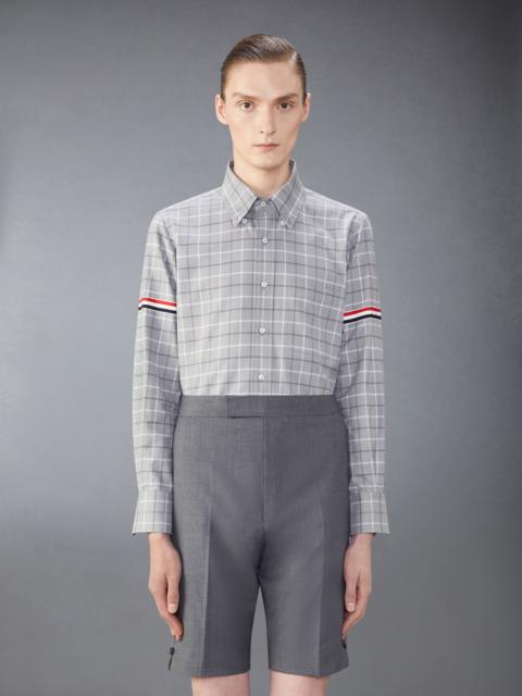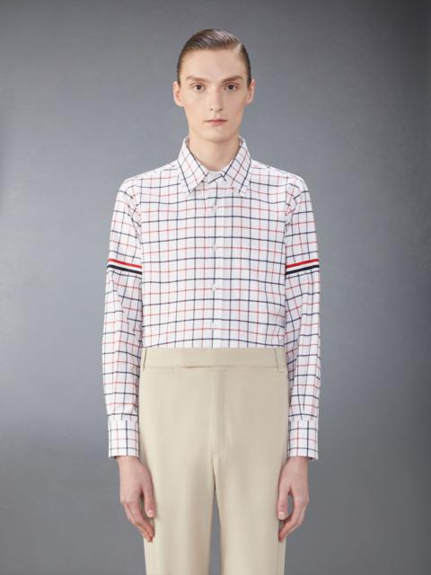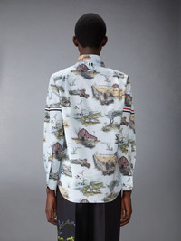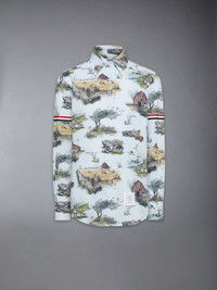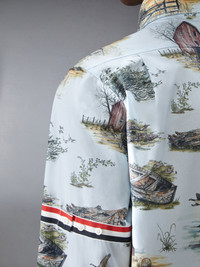 Geese pause in their seasonal migration, leisurely resting by the wetlands, while Hector moseys through the scene, a quiet companion in their downtime. Depicted with as much intricacy as a work of fine art, this is a piece not just to wear but to experience. Featuring signature Thom Browne emblems: our grosgrain armbands and name tag applique. Made to pair with our Goose Scenic Satin Stitch Wool Chino Trousers. Front button closure Chest patch pocket Buttoned armbands with signature striped grosgrain trim Name tag applique Pleated back yoke with locker loop Signature striped grosgrain loop tab Model is 6'1" (185cm), wearing size 1 100% Cotton Made in Italy MWL301O-F0976-996