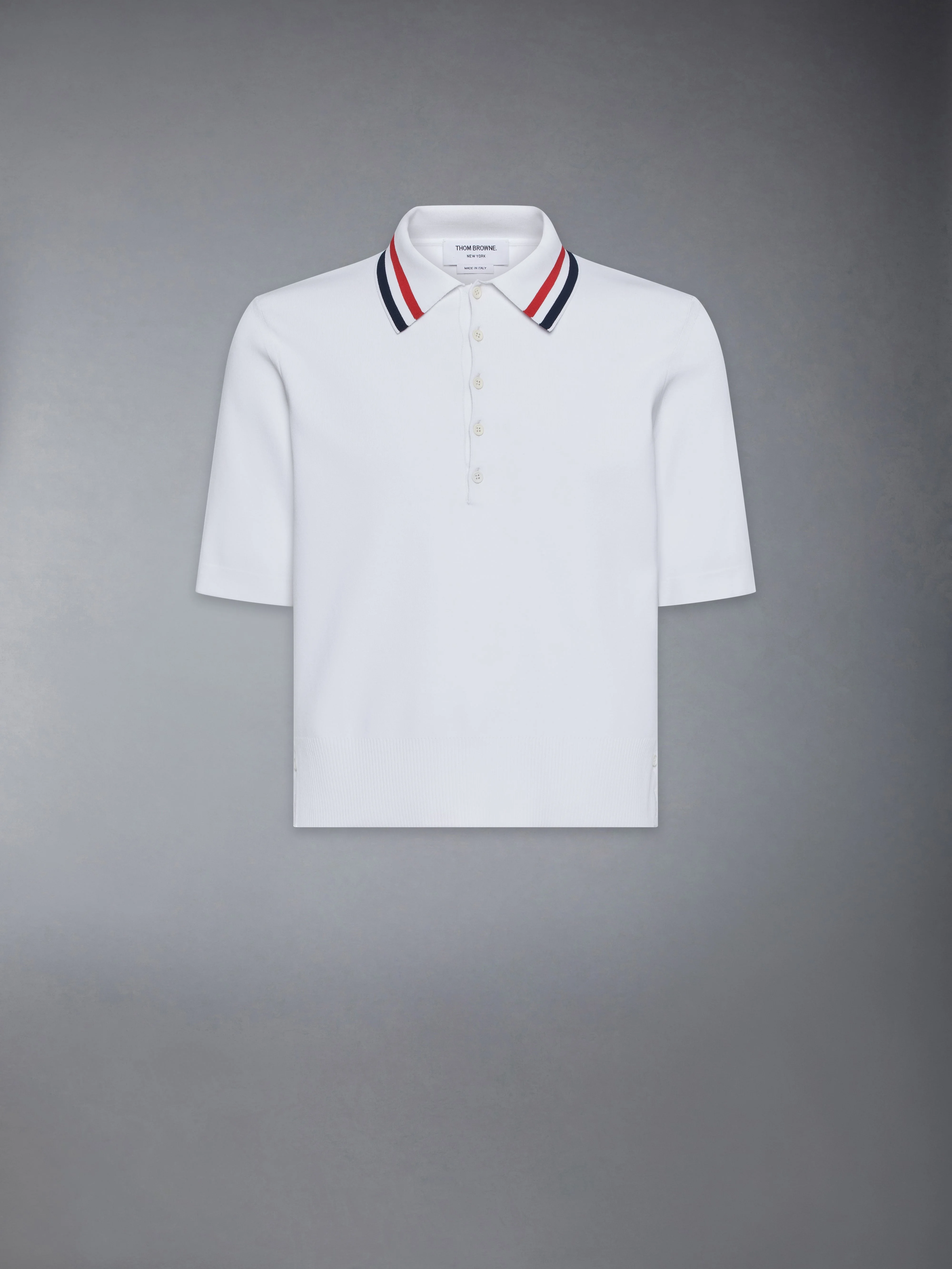 Inspired by East Coast preppy icons, this tennis polo borrows from Thom Browne's very own love of sport. Find our distinct grosgrain trim throughout. Partial front button placket Buttoned side vents with signature striped grosgrain trim Signature striped grosgrain loop tab Model is 6'1" (185cm), wearing size 1 83% Viscose, 17% Polyester Made in Italy MKP136A-Y5502-100