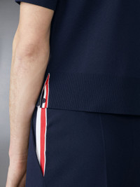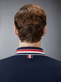 DETAILS & FIT Inspired by East Coast preppy icons, this tennis polo borrows from Thom Browne's very own love of sport. Find our distinct grosgrain trim throughout. Partial front button placket Buttoned side vents with signature striped grosgrain trim Signature striped grosgrain loop tab Model is 6'1" (185cm), wearing size 1 83% Viscose, 17% Polyester Made in Italy MKP136A-Y5502-415