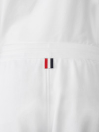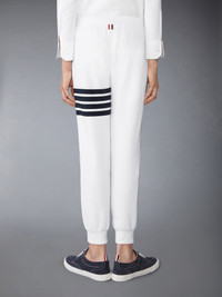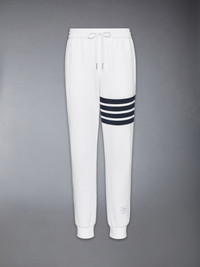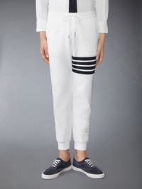 These luxe sweatpants feature a signature Thom Browne emblem—iconic 4-bar detailing inspired by midcentury collegiate and sports uniforms. The four stripes symbolize discipline, achievement, and tenacity, values at the heart of Thom Browne. Crafted from fine cotton, this piece is a timeless classic. Complete the look with our Zip Up Hoodie in Classic Loopback W/ Engineered 4-Bar. Pull-on Drawstring waistband with silver tone aglets 4-bar detailing Side slip pockets Name tag applique Signature striped grosgrain loop tab Model is 6'1" (185cm), wearing size 0 100% Cotton Made in Italy MJQ230A-00535-104 MJQ230A-00535-104
