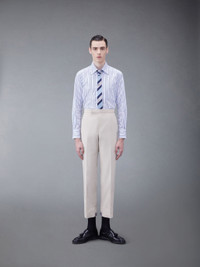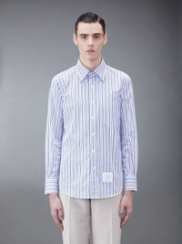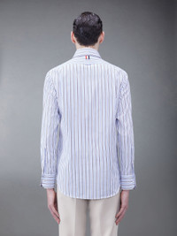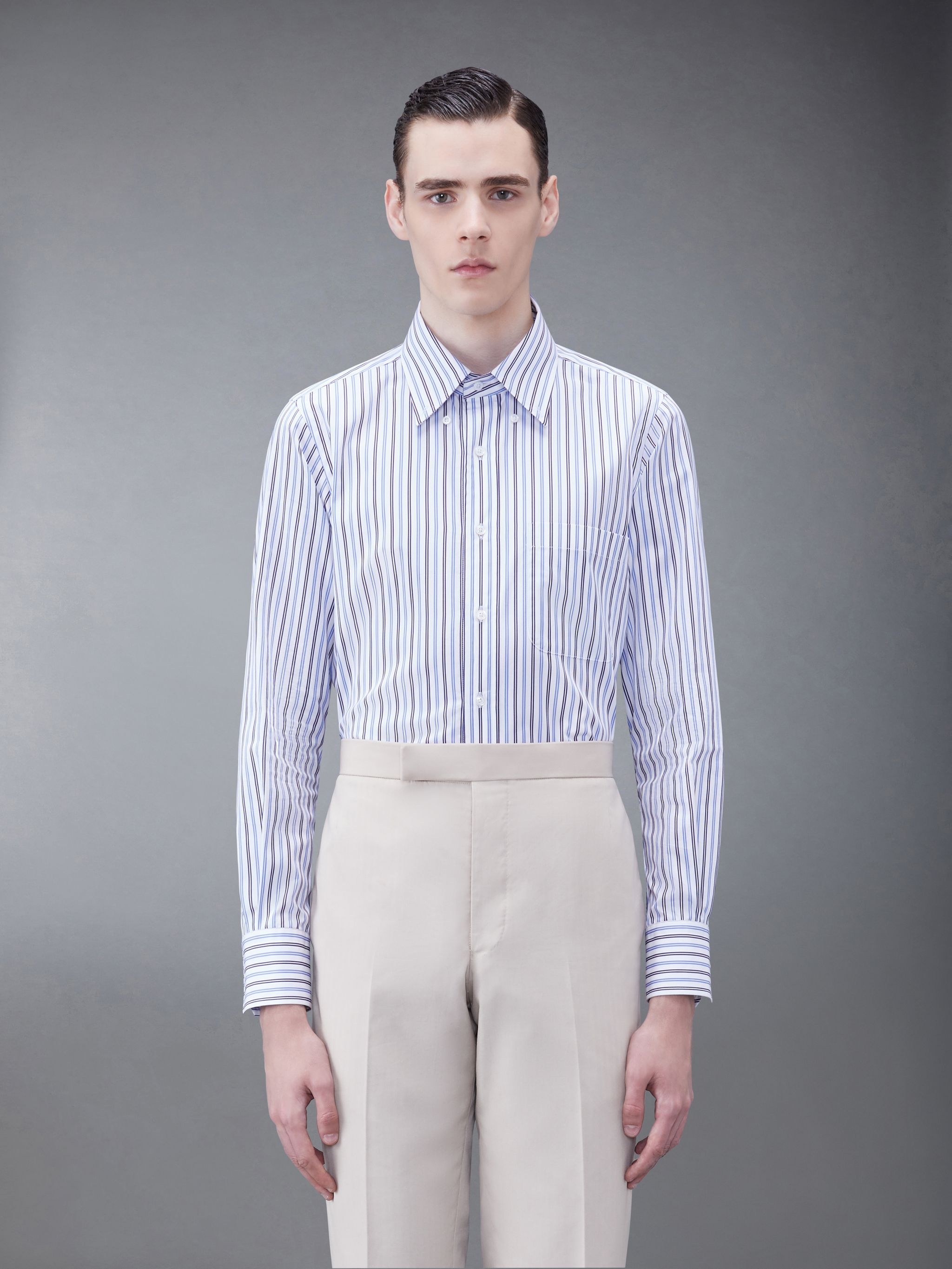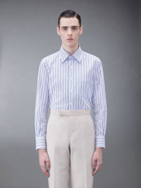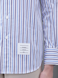 DETAILS & FIT A Thom Browne essential, our Poplin Striped Shirt exhibits quality craftsmanship and meticulous tailoring. Front button closure Patch chest pocket Name tag applique above hem Pleated back yoke with locker loop Signature striped grosgrain loop tab Model is 6' 1" (185cm), wearing size 1 100% Cotton MWL272A-F0552-415
