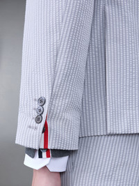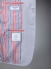 DETAILS & FIT This dapper sport coat exudes Thom Browne's mastery of innovative design. Featuring crisp tailoring and a breezy seersucker fabric, this limited-edition piece will serve as a staple in your spring wardrobe. Front button closure 2 front flap pockets Single chest pocket Double back vent Buttoned cuffs with signature striped grosgrain trim Striped lining with interior pockets and name tag Signature striped grosgrain loop tab Classic- Fit 1 Model is 6' 1" (185cm), wearing size 0 100% Cotton Lining: 100% Cupro Made in Japan MJC001H-F0600-055