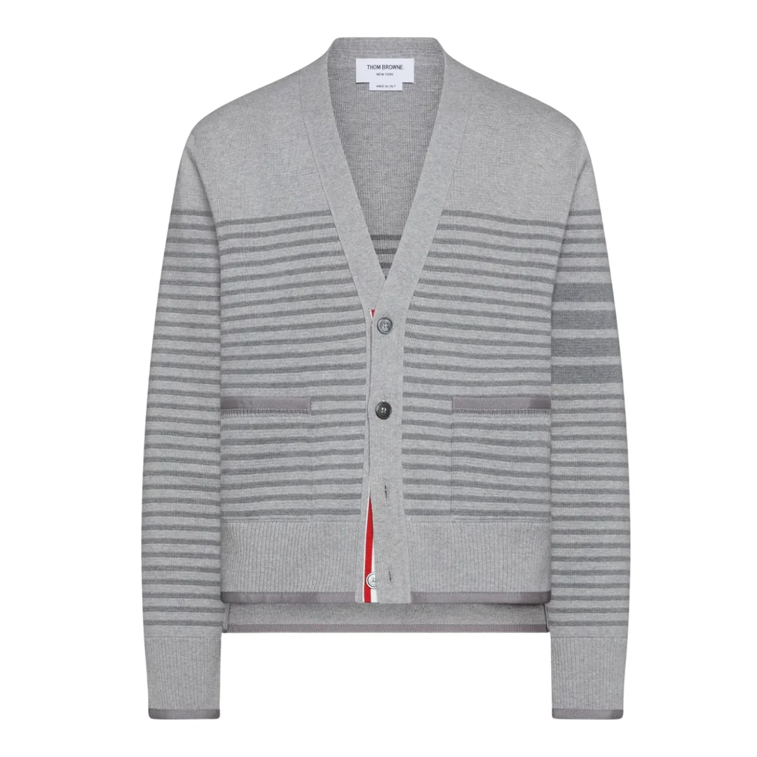 300051373GRY-00 / E6MKC627A-Y3006/00/982 - Milano stitch knit construction - Button-front closure - V-neckline - Ribbed cuffs and hem - Striped pattern throughout - Boxy relaxed fit - Signature red, white and blue trim details The Thom Browne Striped Milano Stitch Boxy Fit Cardigan delivers contemporary tailoring with relaxed sophistication and architectural construction. Crafted from premium Milano stitch knit in sophisticated grey with signature striped detailing, featuring the brand's iconic proportions and precise finishing. The oversized silhouette and signature Thom Browne aesthetic create a modern statement piece for elevated casual wardrobes.