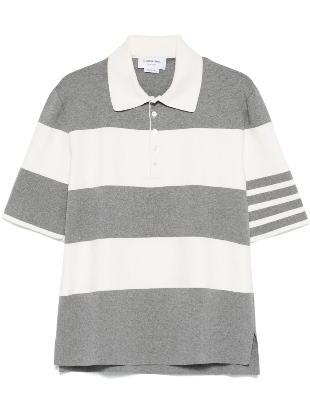 striped polo shirt Highlights - Medium grey - Short front button fastening - Short side slits - Signature 4-bar stripe - Short sleeves Made in Italy Composition Cotton 100% SIZE & FIT Model measurements Height 6 ft 2 in(1.87 m) Bust/Chest 36.41 in(92.5 cm) Hips 35.43 in(90 cm) Waist 29.52 in(75 cm) FittingInformation Designed for a relaxed fit, this polo shirt offers comfort and movement Made with a midweight knit, this piece offers some stretch