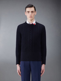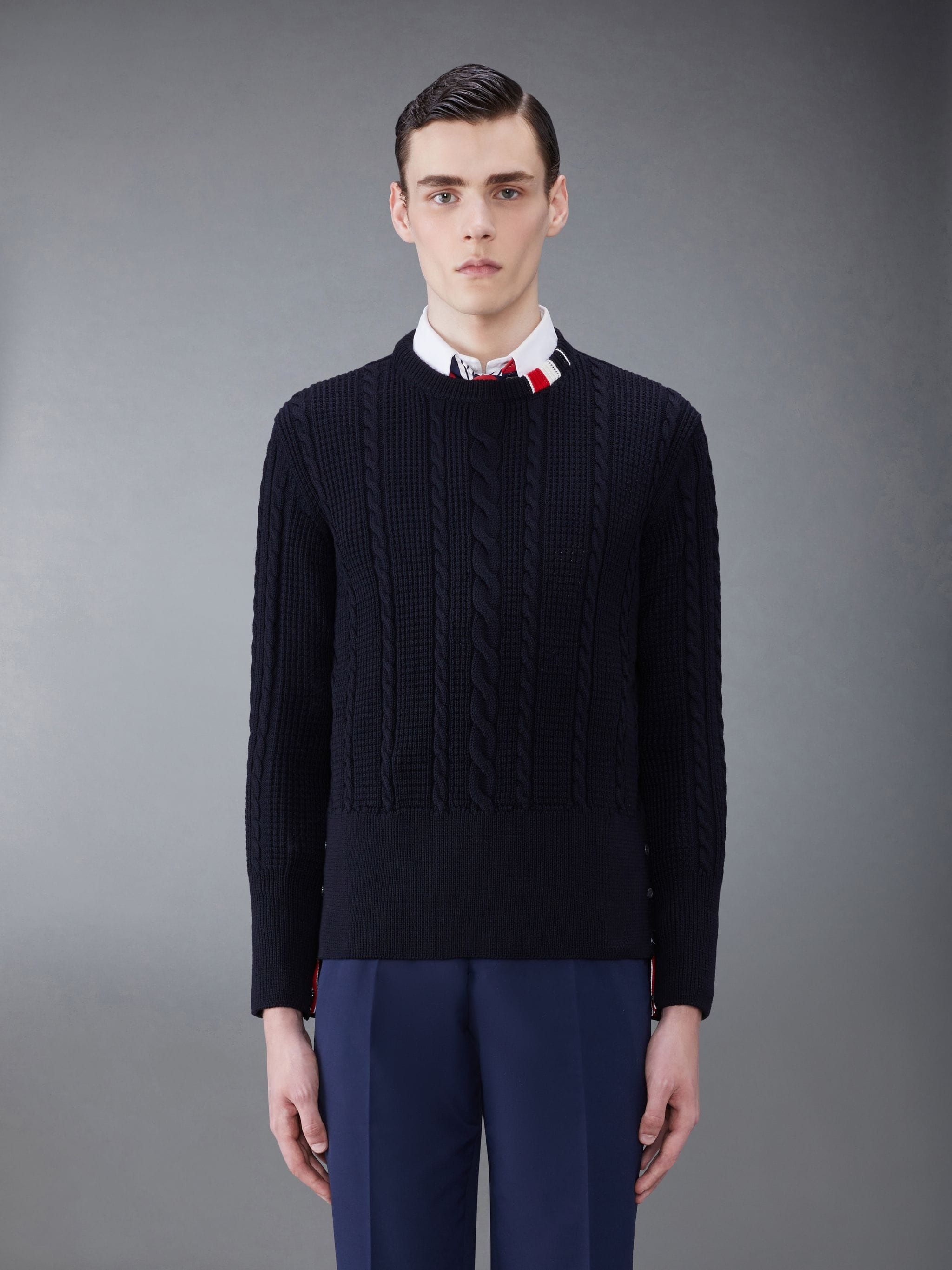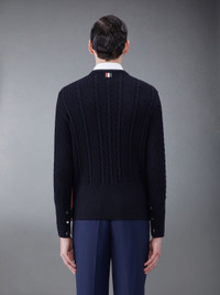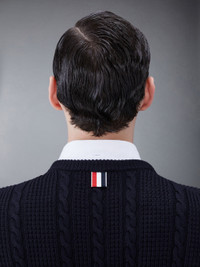 DETAILS & FIT This luxurious pullover exudes Thom Browne's mastery of innovative design and tailored excellence. Crafted from fine virgil wool. Buttoned cuffs with signature striped grosgrain trim Buttoned side vents with signature striped grosgrain trim Signature striped grosgrain loop tab Model is 6' 1" (185cm), wearing size 1 100% Virgin Wool MKA492A-Y1024-415