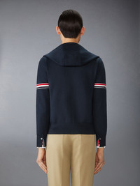 Zip hoodie in navy Milano stitch cotton with striped grosgrain armbands. 2-way zip closure, drawstring hood, slant welt side pockets. Buttoned cuffs with signature striped grosgrain trim. Model is 6' 1" (185cm), wearing size 0. 100% Cotton Made in Italy MKT008A-Y3007-415