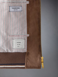 Paying homage to collegiate classics, bold "Browne" lettering and the number 65 — a nod to Thom's birth year—are rendered in an iconic font, famously tied to Notre Dame. Polished snap buttons, engraved with the Thom Browne insignia, reflect Thom's unwavering dedication to perfection—where every detail, no matter how small, is crafted with intention and the utmost care. Front zip closure Side slip snap button pockets Signature striped grosgrain loop tab Model is 6'1" (185cm), wearing size 1 100% Calf Leather Combo 1: 45% Wool, 45% Acrylic, 8% Polyamide, 2% Elastane Lining: 100% Cupro Lining 2: 100% Cotton Made in Italy MJO250X-L0140-205