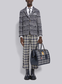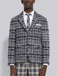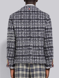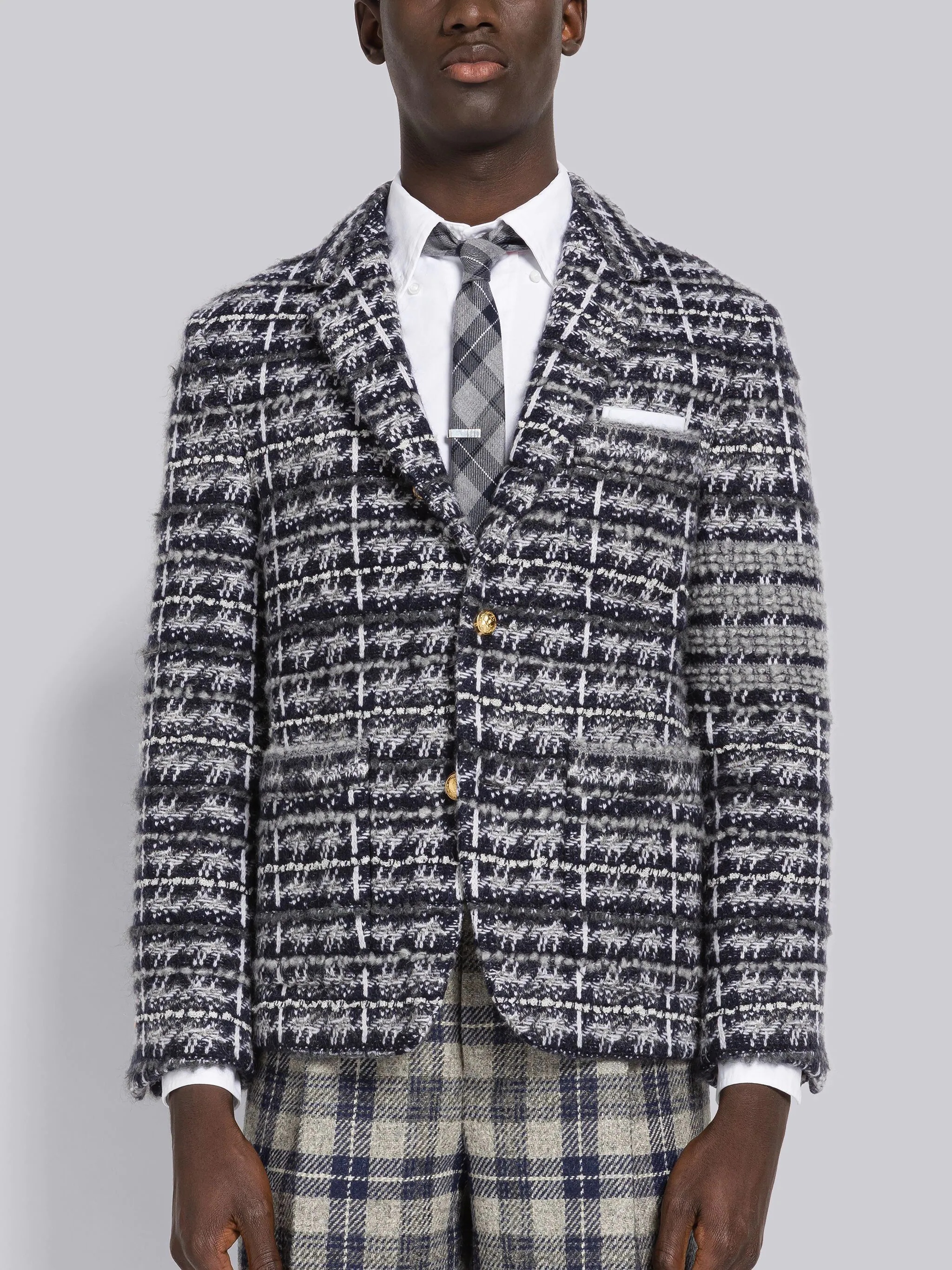 DETAILS & FIT Sack jacket in medium grey tartan inlay Merino wool with 4-bar stripe detail at left sleeve in grey. Brass 2-button closure, notched lapels, 3 patch front pockets. Single back vent. Buttoned cuffs. Grey jersey lining with name tag applique. Signature striped grosgrain loop tab at back of neck. Sack - Fit 2. Model is 6' 1" (185cm), wearing size 0. 69%Wool, 20%Mohair, 10%Polyamide, 1%Alpaca Lining1: 100%Cotton Lining2: 100% Cupro Made in Italy MKJ091AY9021035