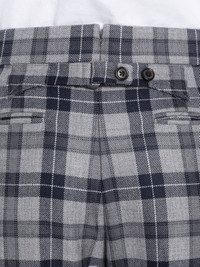 DETAILS & FIT Classic backstrap trouser in medium grey tartan wool twill suiting. Zip fly and tab closure, flat front, creased legs, wide cuffs. Slip side pockets, button-fastening back welt pockets. Adjustable buttoned backstrap. Signature striped grosgrain loop tab at back waist. Classic - Fit 1. Model is 6' 1" (185cm), wearing size 0. 100% Wool Lining:100% Cupro Made in Italy MTC001A08155035