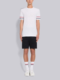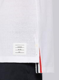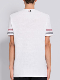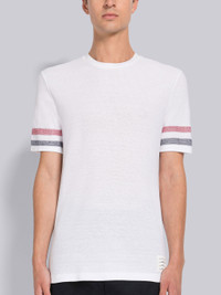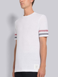 DETAILS & FIT Short sleeve tee in white textured cotton with engineered stripe details at sleeves. Crew neckline, name tag applique above hem. Signature striped grosgrain loop tab at back of neck. Model is 6' 1" (185cm), wearing size 0. 100% Cotton Made in Italy MJS204AJ0046100
