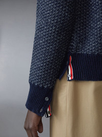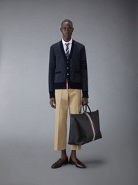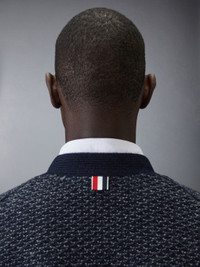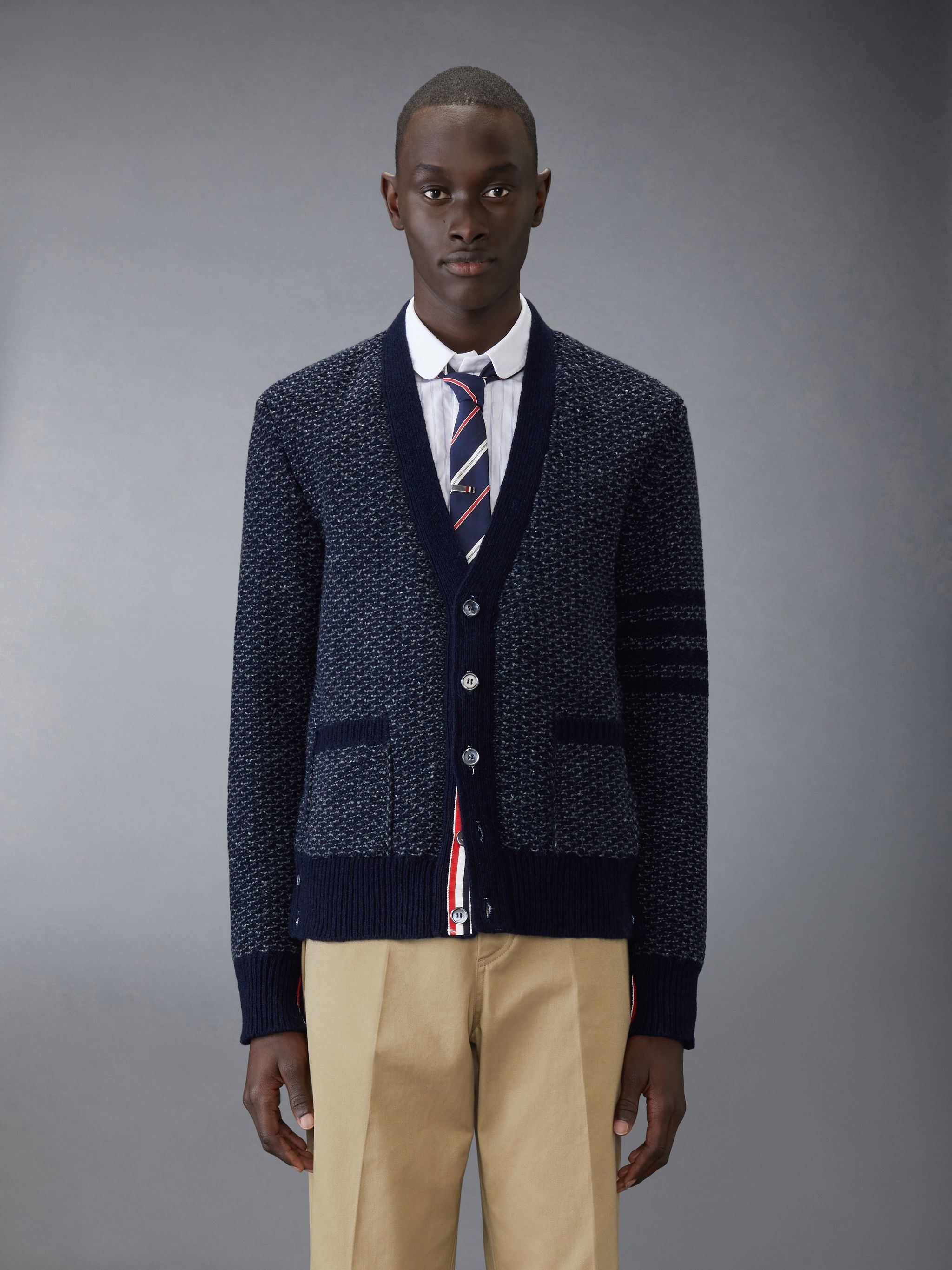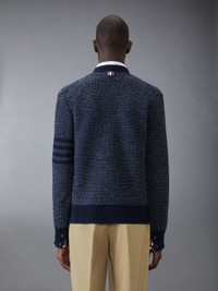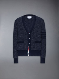 DETAILS & FIT A signature Thom Browne emblem defines this luxe cardigan— 4-bar detailing. Presented in fine wool and mohair fabric, this cardigan is a classic that will stand the test of time. V neckline Front button closure 2 Front slip pockets 4-bar detailing Buttoned side vents with signature striped grosgrain trim Buttoned cuffs with signature striped grosgrain trim Signature striped grosgrain loop tab Model is 6'1" (185cm), wearing size 1 70% Wool, 30% Mohair Made in Ireland MKC578A-Y1032-415