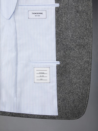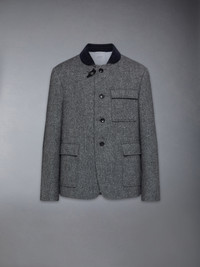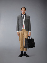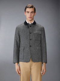 Thom Browne reimagines the classic shawl with luxurious Donegal tweed. Designed with three roomy pockets and hallmarks of traditional menswear tailoring: suede elbow patches and contrast collars. Front button closure 3 Front flap pockets Interior pockets with name tag Single back vent Signature striped grosgrain loop tab Model is 6'1" (185cm), wearing size 1 100% Wool Combo 1: 100% Cotton Lining: 100% Cotton Lining 2: 100% Cupro Made in Italy MJU574C-05385-980