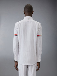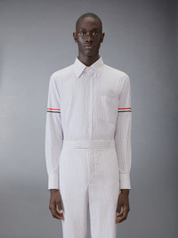 DETAILS & FIT An elevated shirt enriched with signature Thom Browne emblems. Front button closure Chest patch pocket Nametag applique Grosgrain armbands Pleated back yoke with locker loop Signature striped grosgrain loop tab Model is 6'1" (185cm), wearing size 1 100% Cotton Made in Italy MWL301O-F0810-035