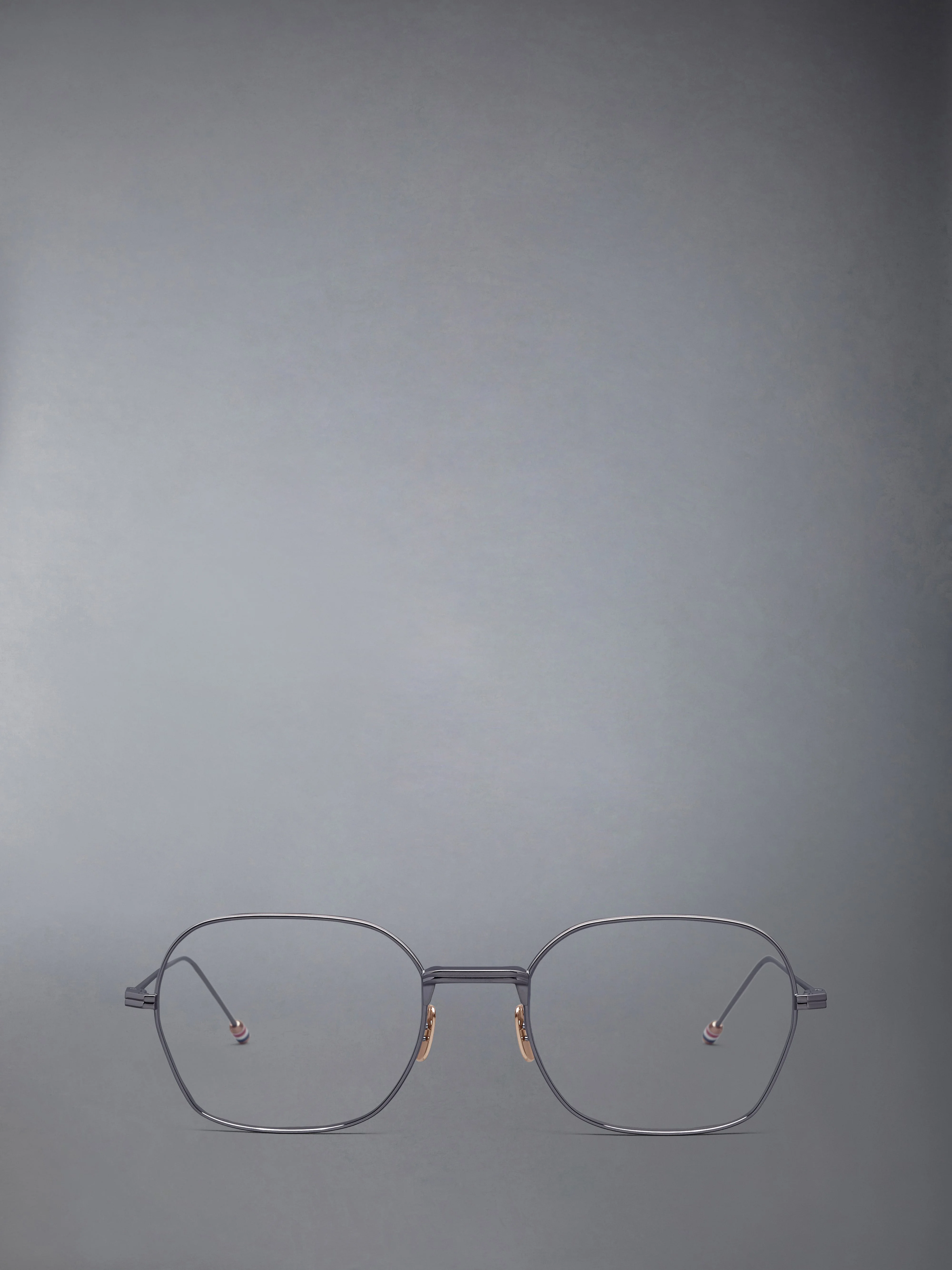 Minimal in form, meticulous in design. These frames, made in Japan from premium materials, highlight scale and craft by balancing structure with subtlety. Anti-reflective lenses reduce glare and enhance optical clarity, while 4-bar detailing and tricolor enamel temple tips finish the design, bringing Thom Browne’s refined vision to daily wear. Rectangular shape Signature 4-bar Striped enamel temple tips Eco-leather case Frame: black iron Hinges: silver Lenses: clear-ar Lens Width: 54mm Nose Bridge Length: 20mm Temple Length: 144mm 100% Titanium Made in Japan UEO945A-G0001-004