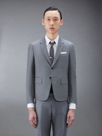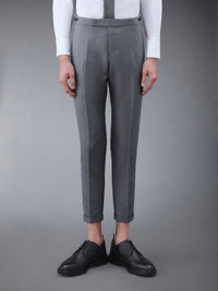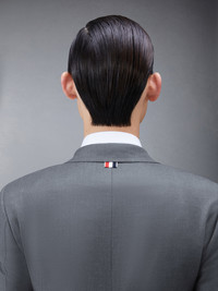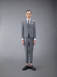 Our Twill High Armhole Suit and Tie embraces a slimmer fit taken from punk influences while remaining true to Thom Browne classic heritage. Since its introduction, the slim-fit suit has maintained its loyal devotees. Front button closure Notched lapels 3 flap front pockets, single chest pocket Buttoned cuffs with signature striped grosgrain trim Double back vent Striped sport coat lining with interior pocket and name tag Tab trouser closure Adjustable buttoned side tabs Slip side pockets, Button-fastening jetted hip pockets Creased legs Narrow cuffs Signature striped grosgrain loop tab at back of neck and waist Classic slim tie High Armhole and Low Rise - Fit 3 Model is 6' 1" (185cm), wearing size 0 100% Wool Lining: 100% Cupro Made in Italy MSC159A-00626-035
