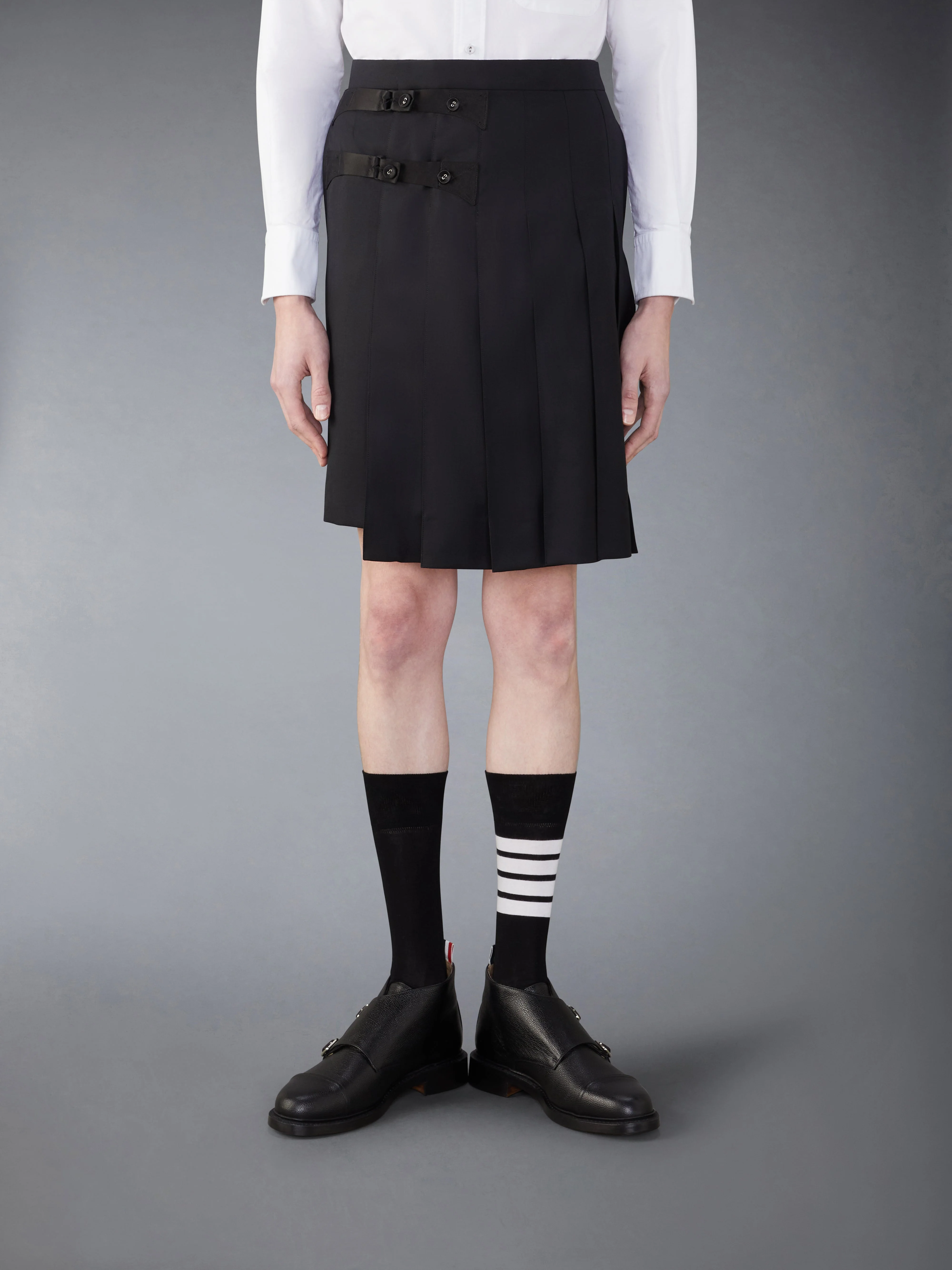 DETAILS & FIT Our Super 120's Twill Backstrap Skort combines the elegance of a skirt with the comfort of shorts. This versatile silhouette will surely be a staple in your fall/winter wardrobe for years to come. Front button straps Button-fastening back welt pockets Adjustable buttoned backstrap Signature striped grosgrain loop tab Model is 6' 1" (185cm), wearing size 0 100% Wool Combo1: 100% Silk Lining: 100% Cupro Made in Italy MTC225C-00626-001