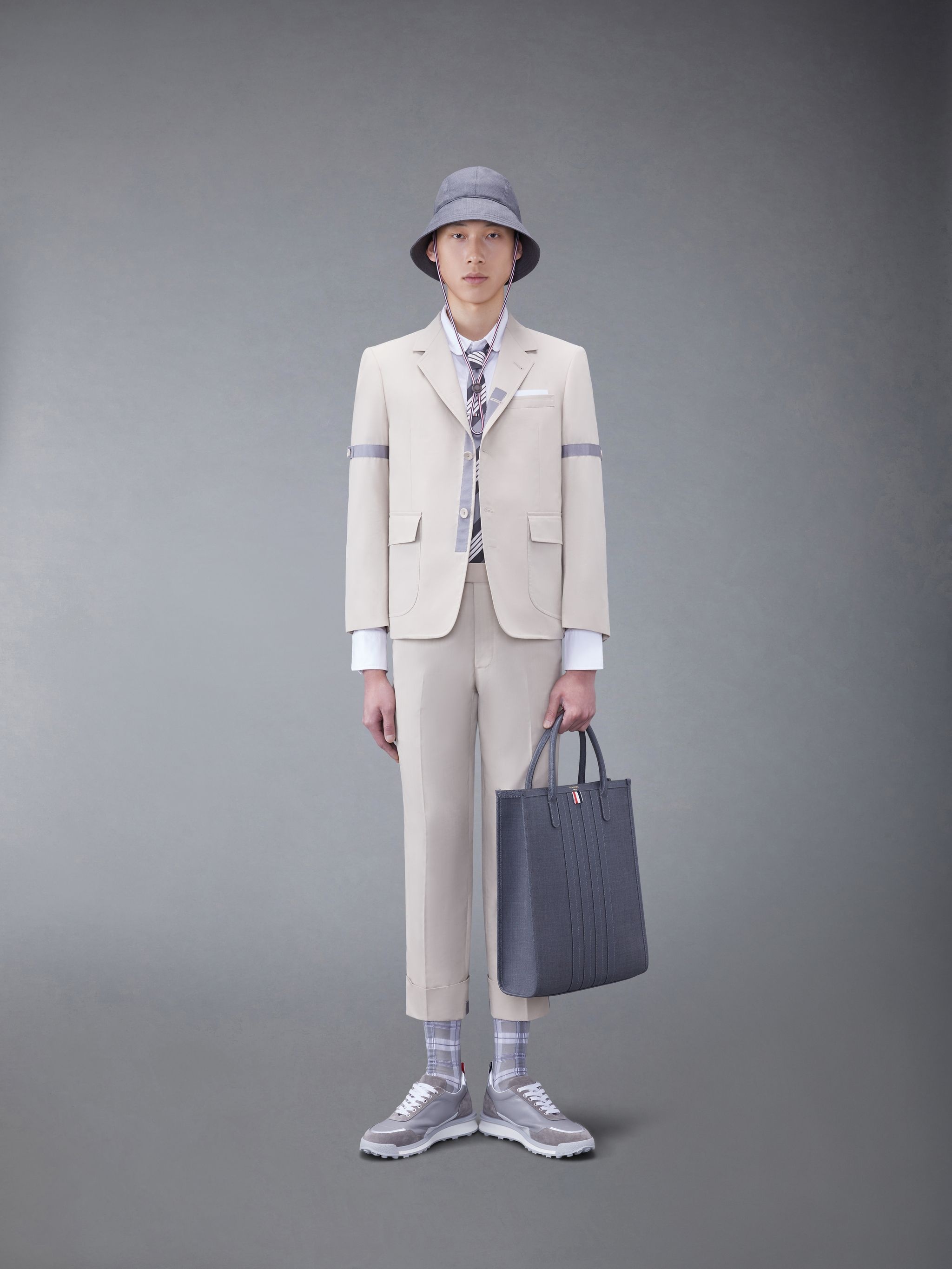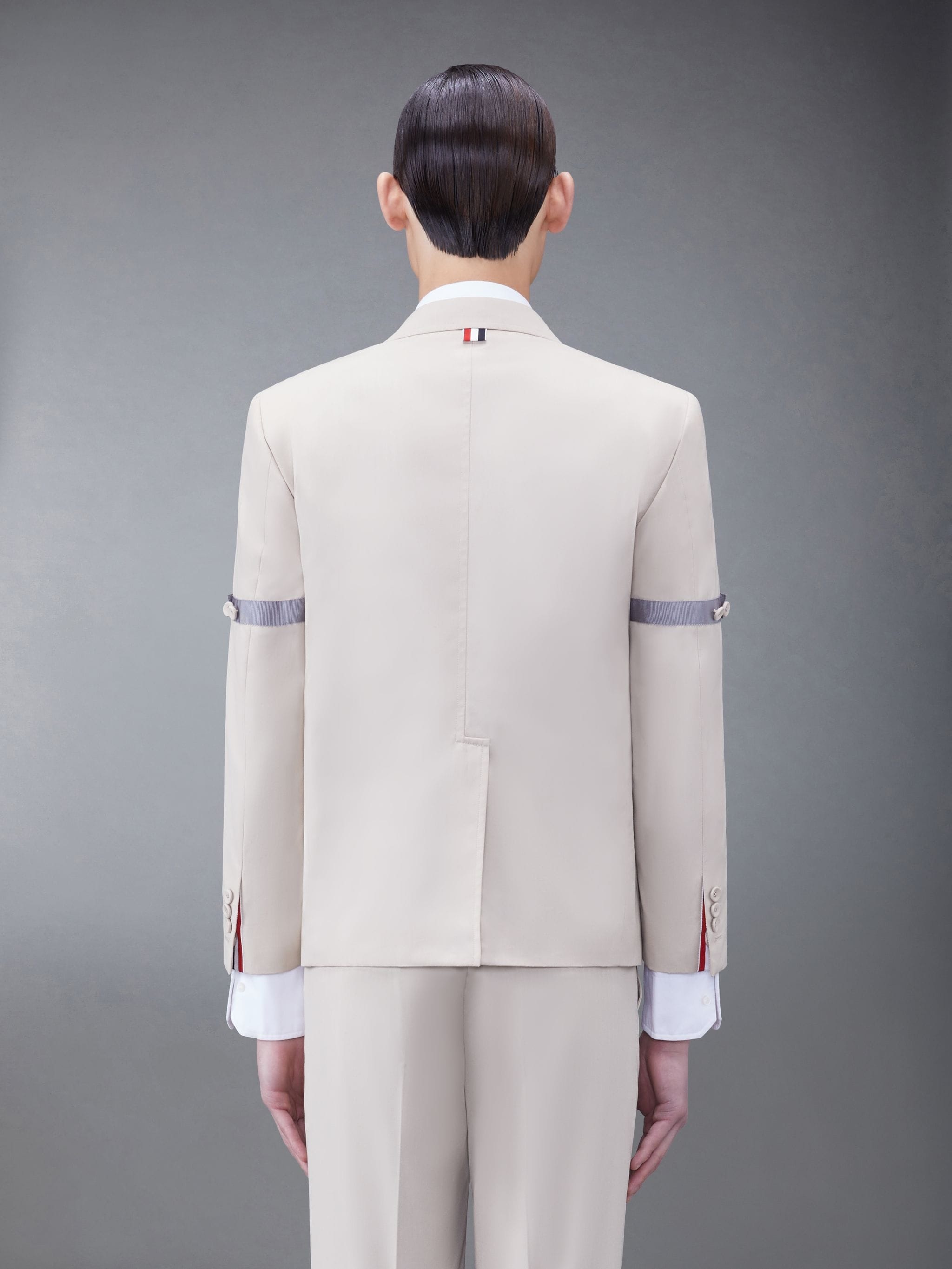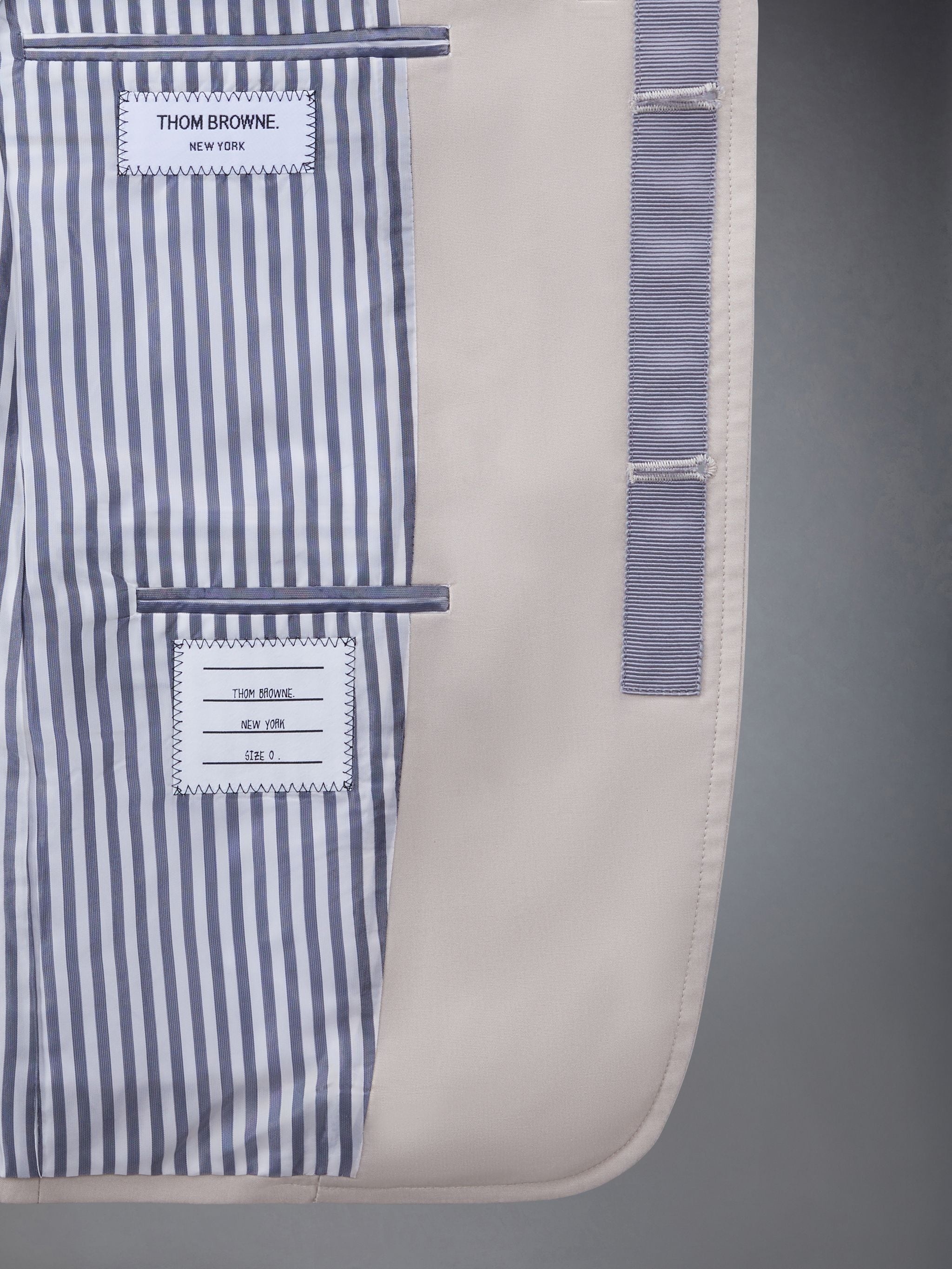 DETAILS & FIT This dapper sport coat exudes Thom Browne's mastery of innovative design and tailored excellence. Our iconic grosgrain trim lines the front placket and buttoned armbands. Front button closure Armbands Unstructured straight fit Buttoned cuffs with signature striped grosgrain trim 2 flap pockets Single chest pocket Single back vent Model is 6' 1" (185cm), wearing size 0 65% Polyester, 35% Cotton Lining: 100% Cupro Made in Japan MJU558O-04502-250