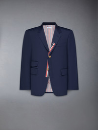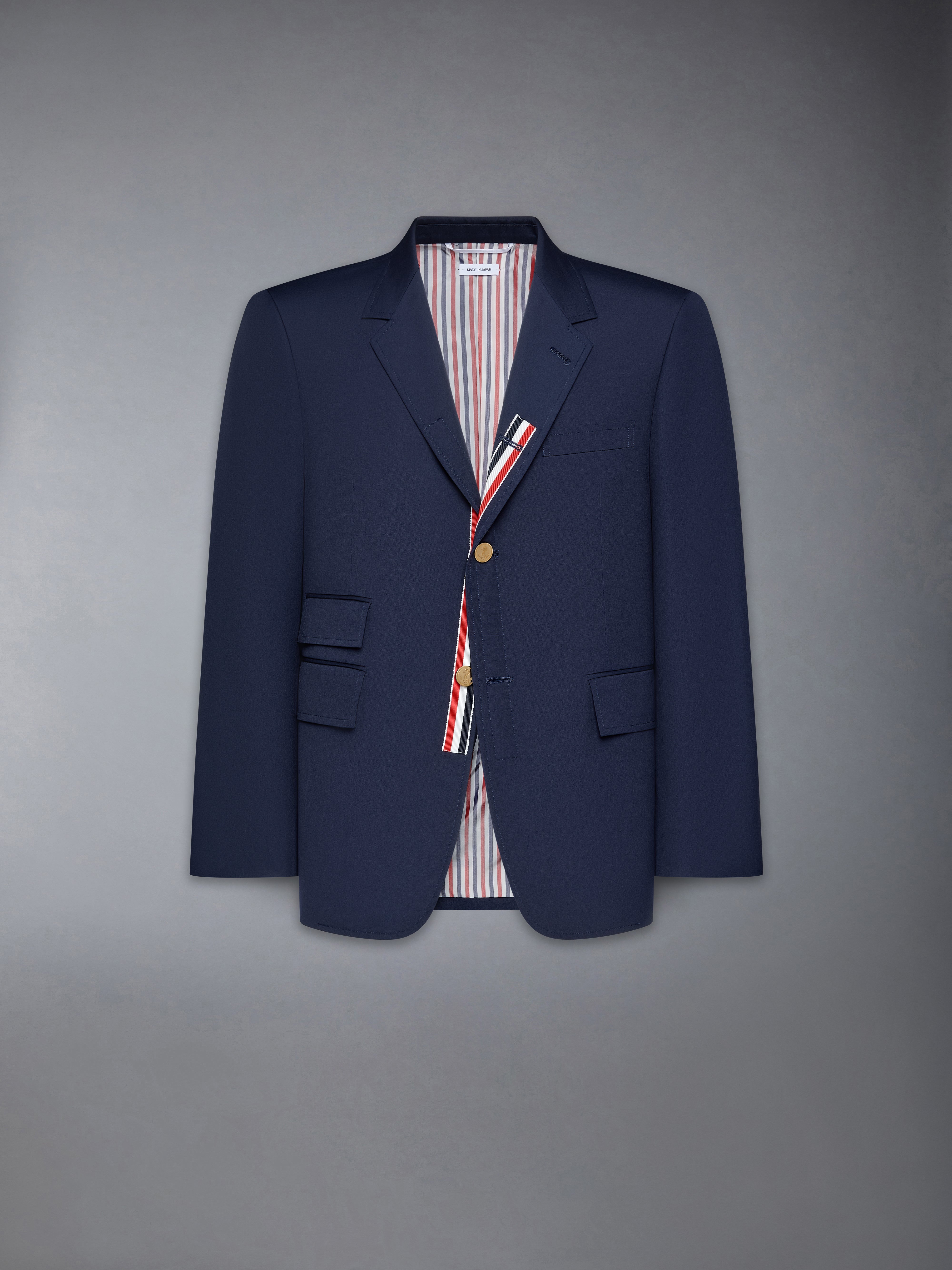 Single breasted sport coat in navy typewriter cloth with grosgrain-trimmed button placket. 2-button front closure, notched lapels, 3 flap front pockets, single chest pocket. Buttoned cuffs with signature striped grosgrain trim. Striped lining with interior pocket and name tag. Signature striped grosgrain loop tab at back of neck. Model is 6' 1" (185cm), wearing size 0. 65% Polyester, 35% Cotton Made in Japan MJC328E-04502-415