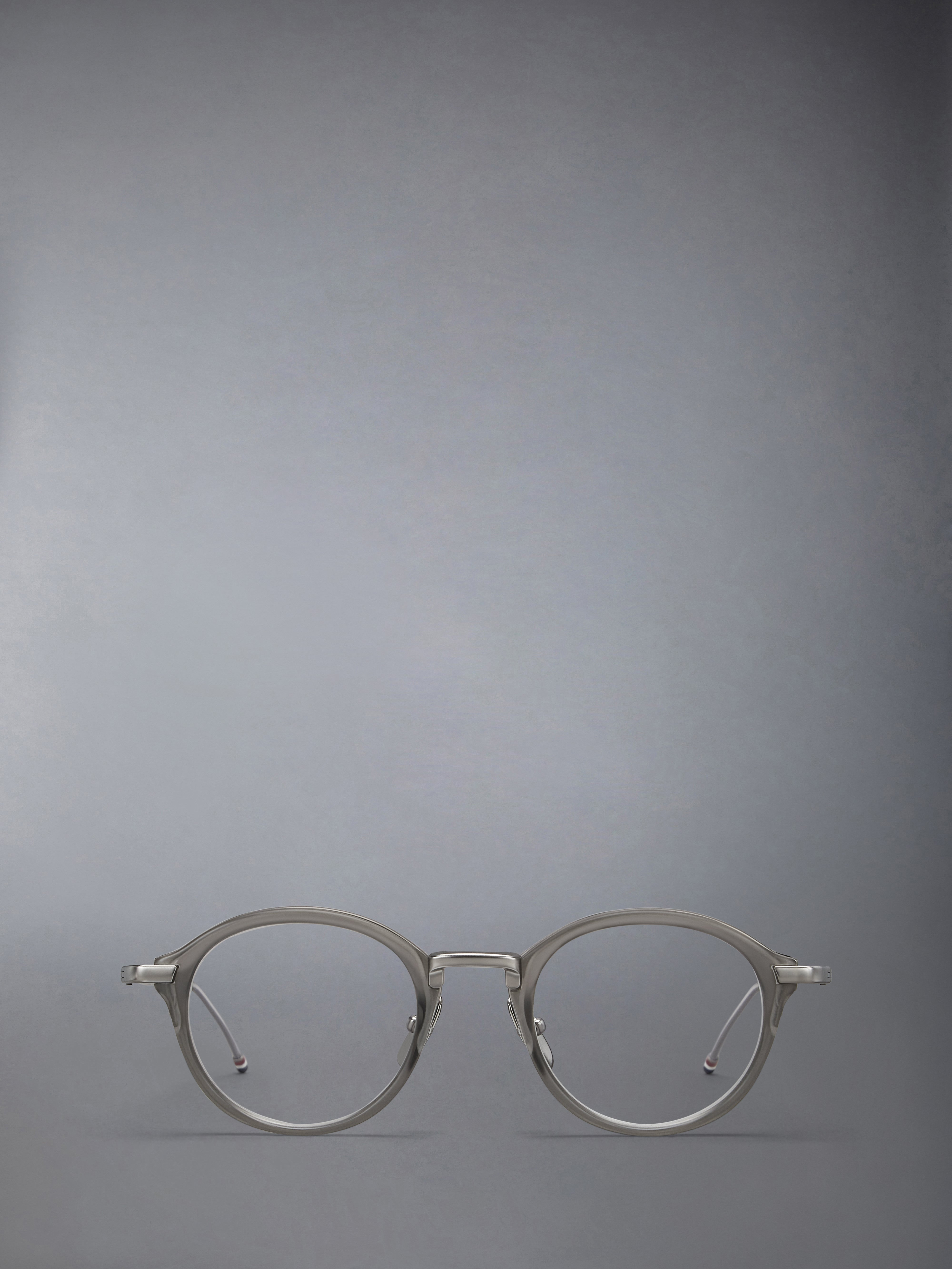 DETAILS & FIT Always true to our American DNA and inspired by mid-century aesthetic, the Thom Browne eyewear collection is ideal for those who appreciate a sleek and sophisticated look. It's designed for individuals who exude confidence and wish to tell a story through their fashion statement. Satin crystal grey acetate and titanium Clear lens Round shape Signature 4-bar Striped enamel temple tips Eco-leather case Lens Width: 49mm Nose Bridge Length: 21mm Temple Length: 150mm 50% Acetate, 50% Titanium Made in Japan UEO011A-G0003-068 - Arm Length: 15.0cm - Bridge Width: 2.1cm - Lens Diameter: 4.6cm - Total Width: 13.5cm